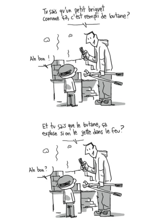 “Transformer la lecture du soir en cours de grammaire ou en usine à cauchemars, rivaliser de puérilité avec ses enfants, leur apprendre les pires bêtises, gagner en trichant, et les mettre au défi de faire pire… Guy Delisle, un mauvais père ? Non, un auteur de bande dessinée qui sait puiser l’imagination là où elle se trouve, avec un sens aigu de l’observation et une bonne dose d’autodérision.”