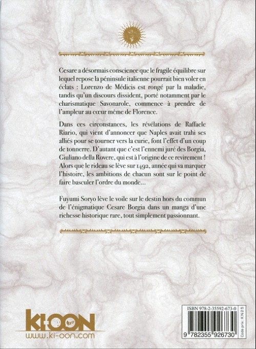 “Fuyumi Soryo lève le voile sur le destin hors du commun de l’énigmatique Cesare Borgia dans un manga d’une richesse historique rare, tout simplement passionnant.”