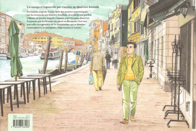 Taniguchi nous fait découvrir Venise à travers ce superbe bouquin illustré à l’aquarelle, présenté dans un format à l’italienne. C’est une sorte de mélange entre un carnet de voyage, le Promeneur et le Gourmet Solitaire avec un texte minimaliste. Il y a vraiment très peu de texte: soixante-douze phrases, soit environ six-cent-soixante-quinze mots! C’est un peu décevant. Par contre, ici ce sont les images qui parlent. C’est graphiquement très beau et, d’une certaine façon, plutôt poétique. À voir, pour les amateur de Taniguchi (et de Venise).