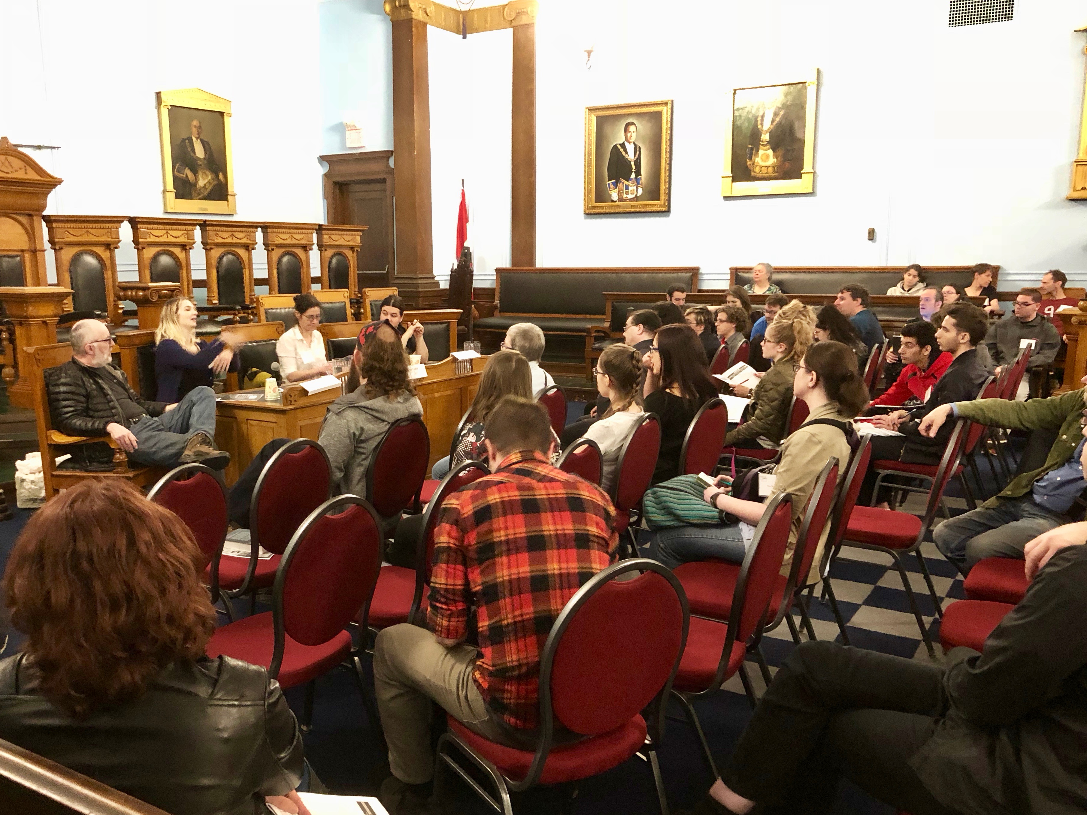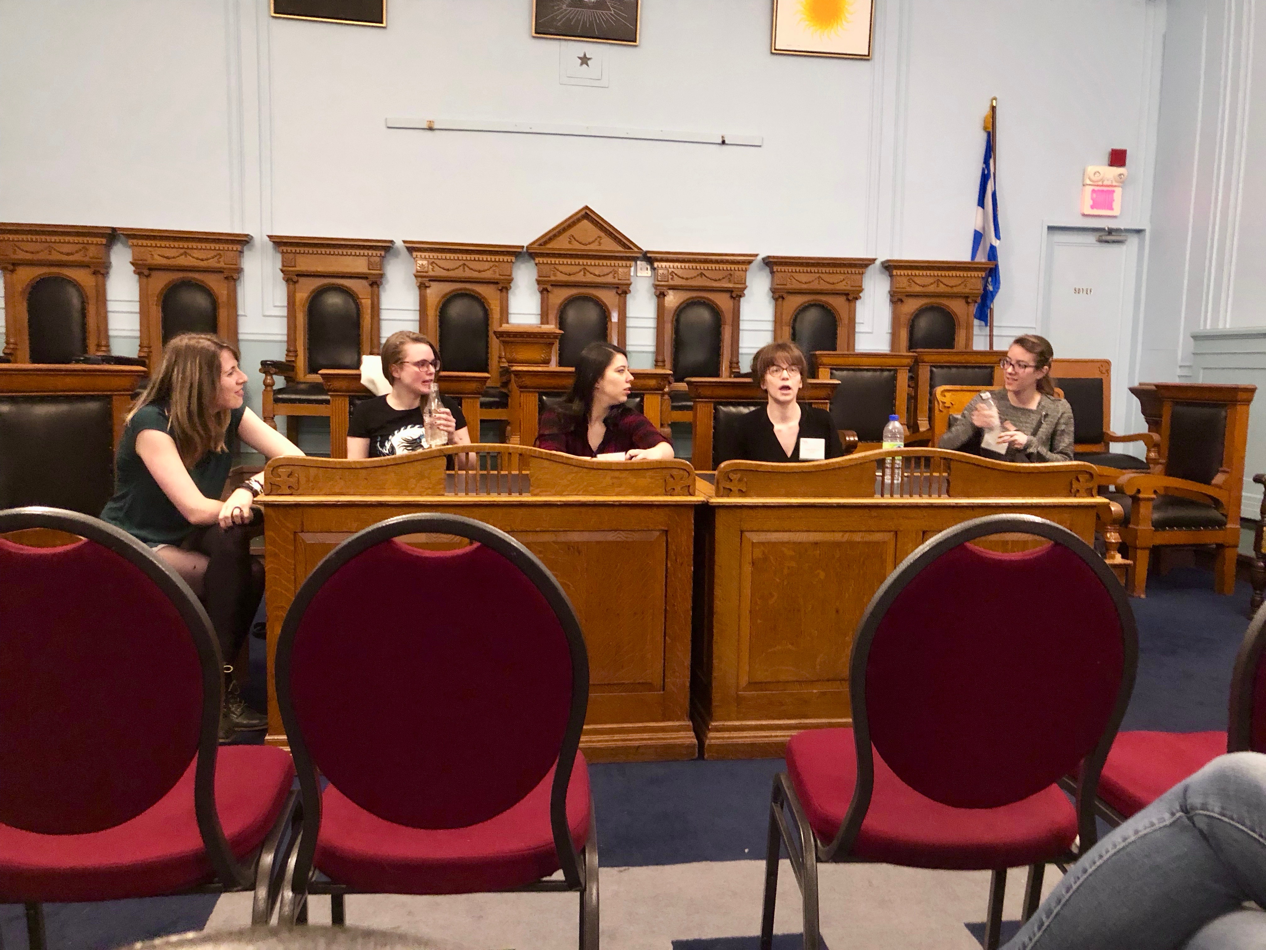 Mon second panel (et celui qui m’intéressait le plus de tout le congrès) est “Booktubeurs, blogueurs et réseaux sociaux”, animé par Raphaëlle B. Adam (coordonnatrice à l’Association des auteures et auteurs de l’Estrie, contributrices sur Brins d’Éternité et Le Fil Rouge), avec Catherine Girard Ratté (bibliothécaire jeunesse et La Biblio Geek sur Youtube et Facebook; elle parle surtout de BD), Pascale Laplante-Dubé (contributrice sur Les Amazones, émission radio et podcast qui donne voix aux femmes et aux minorités geeks, et à la République du Centaure), Joëlle Rivard (contributrices sur Le Fil Rouge et sur Instagram) et Stéphanie Sylvain (elle co-produit Les Filles de Joual, un blogue sur la littérature québécoise, et elle est sur Facebook et Youtube). Ici on s’interroge sur la part qu’occupe les média sociaux dans l’écosystème du livre au Québec et comment cela influence-t-il la critique littéraire. Dans la plupart des cas, il n’est pas vraiment question de critique mais plutôt de suggestions littéraires. On lit ce qu’on a envie de partager ou on partage ce qu’on envie de lire (ses coups de coeur, et, bien sûr, les services de presse que l’on reçoit). C’est plus facile avec les média sociaux car on a un feed-back immédiat. Évidemment, si tu parle seulement de ce que tu aimes, c’est plus plaisant mais c’est moins populaire. Il faut donc être à l’écoute de ce les gens veulent savoir. Le hic est de savoir rejoindre ses lecteurs: en utilisant des mots-clés (comme bookstagram ou livrestagram), en étant constant dans sa diffusion et en publiant préférablement aux heures de plus grand achalandage, en utilisant plusieurs autres plate-formes de diffusion (i.e. Facebook, Youtube, Instagram, etc.) en plus de son blogue, et en utilisant le réseautage (se faire des contacts). Il y a aussi le “Book Haul”, où l’on présente les livres achetés (ou reçu en service de presse) durant le mois courant. Très intéressant tout ça. Et ça fait plaisir de rencontrer d’autres blogueurs (parce que, paradoxalement, malgré que l’on utilise les média dit sociaux, cela ne fait souvent pas de nous de créatures très “sociales”).