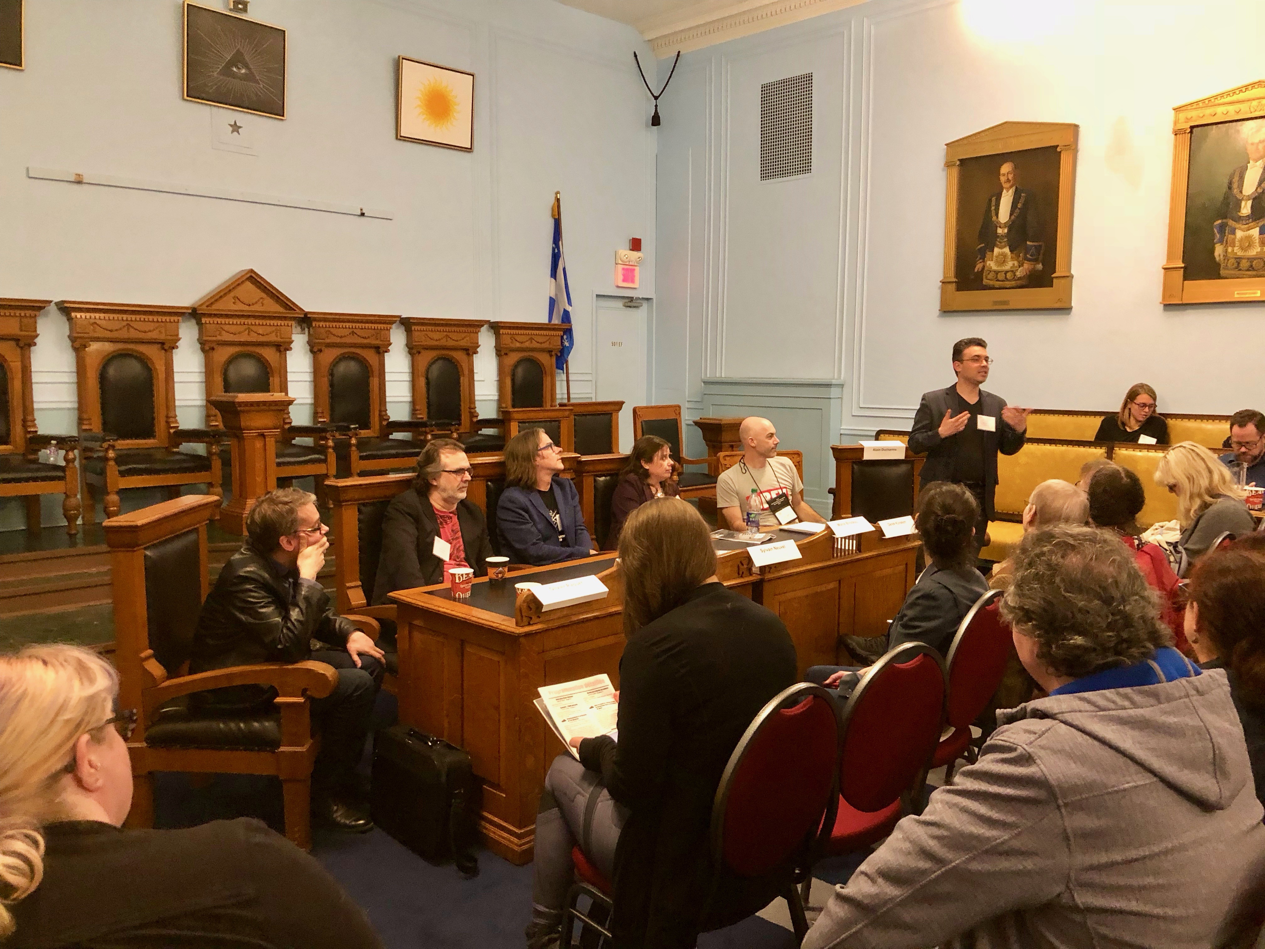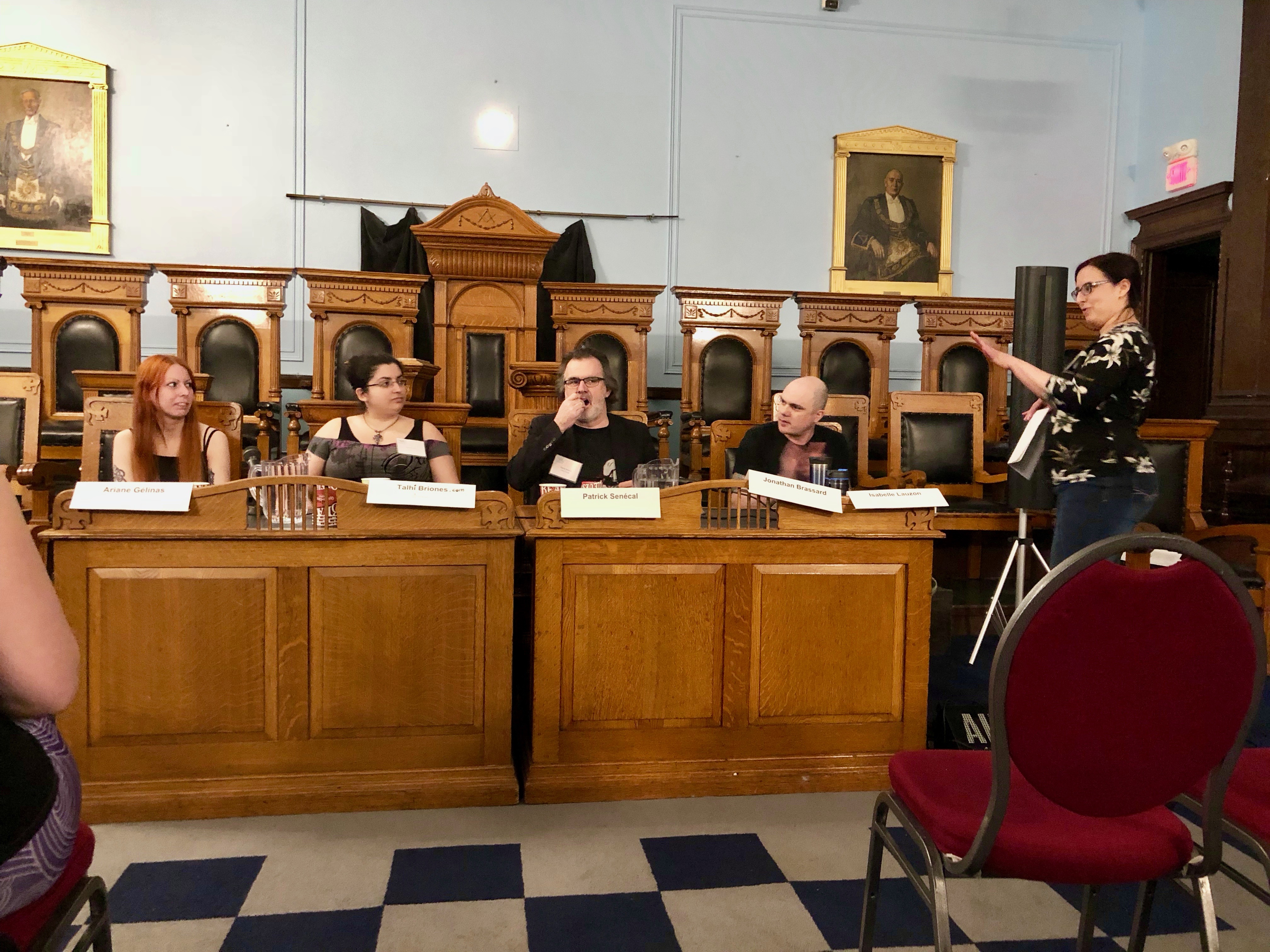 Aujourd’hui (Samedi, 5 mai) j’ai assisté à une enfilade de panels qui m’apparaissaient au départ plus ou moins intéressants, mais qui offraient malgré tout toujours des aspects fascinants qui font de l’événement une occasion incontournable pour en apprendre plus sur la nature du genre ou sur la faune colorée formée par les auteurs et autres intervenants du milieu. J’y ai appris, par exemple, que l’éditeur Rivière Blanche (filiale francophone de l’éditeur américain Black Coat Press) avait été créé pour prendre la suite et rendre hommage à Fleuve Noir (non seulement en publiant des textes nostalgiques des années ’70, en pastichant ses couvertures mais aussi en poursuivant la numérotation de ses volumes là où Fleuve Noir s’était arrêté!); que Jo Walton écrivait de l’ “uchnonie discrète”; ou que l’on pouvait faire de la poésie de science-fiction (c’est le cas avec Nous rêvions de robots de Isabelle Gaudet-Labine)… Et le lieu où se déroulait les panels (le Temple Maçonnique de Montréal!) était vraiment fascinant…