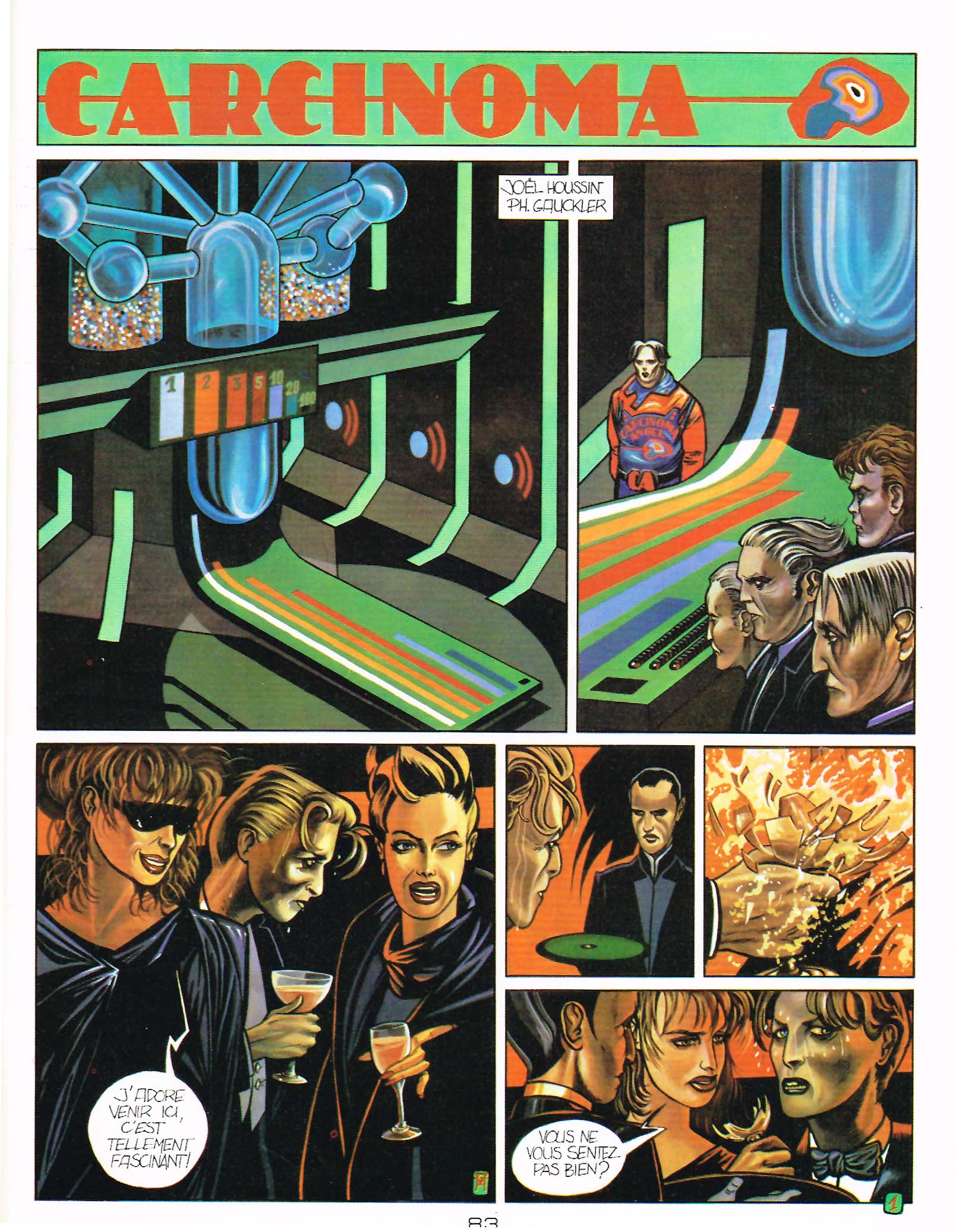 “Carcinoma” (MH 100, p. 83) est une courte histoire de trois pages qui présente de gigantesque amélioration. Gauckler a changé de scénariste et il faut croire que cela fait une différence. Cette fois il fait équipe avec l’auteur de SF bien connu, Joël Houssin. Le récit est moins statique mais les personnages sont encore assez rigides. C’est néanmoins déjà de la BD, même si le récit est à l’étroit et m’apparaît un peu nébuleux.