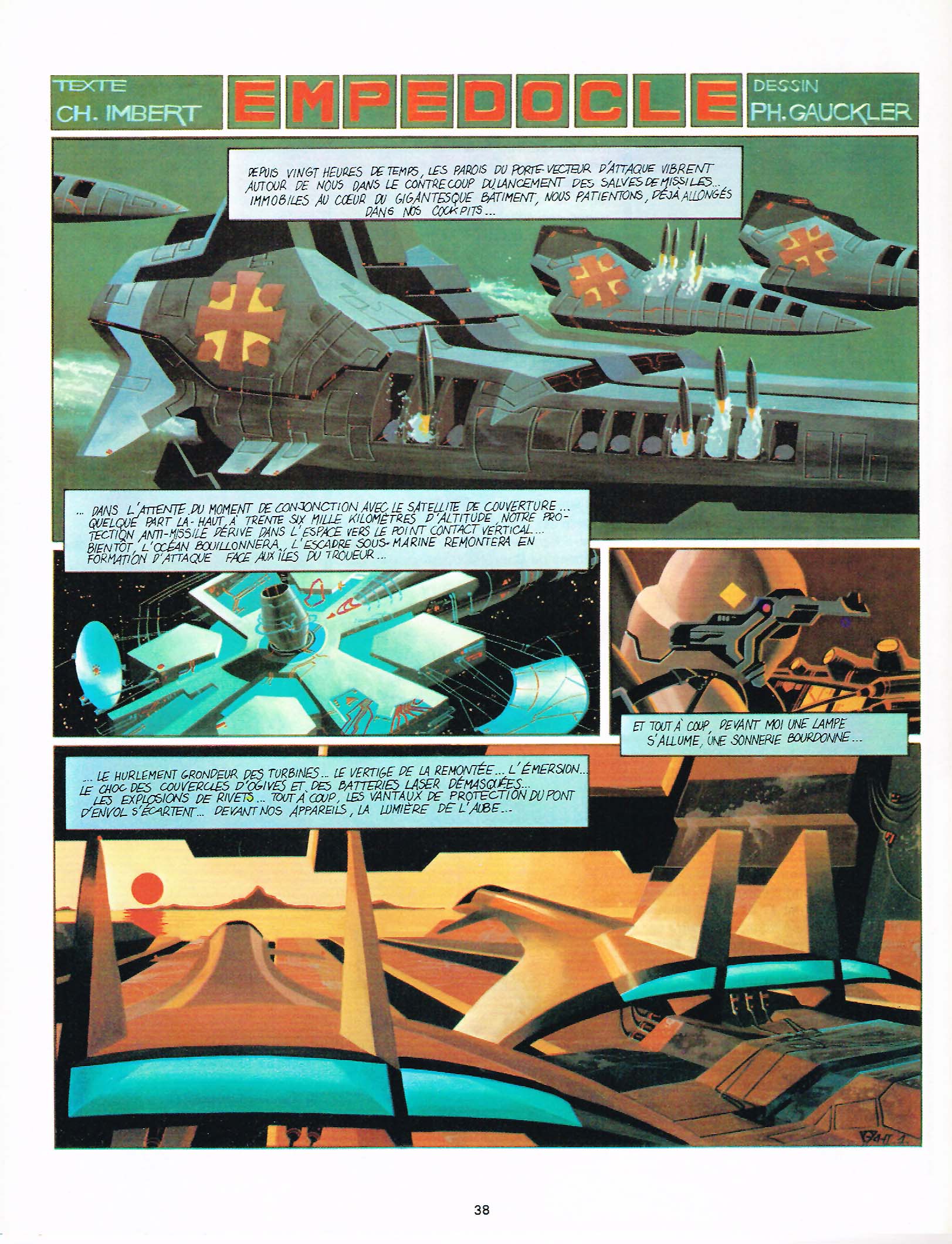 “Empedocle” (MH 85, p. 38, 12 pages) fait directement suite au récit précédent. Il y a beaucoup de dessins de vaisseaux et de scaphandres, ce qui donne une impression de froideur aux planches. Toutefois dès que les personnages interviennent, c’est déjà mieux, plus chaleureux, mais cela demeure encore trop statique à mon goût. C’est une belle histoire qui offre un univers intéressant que l’on découvre à travers de beaux dessins, mais la rencontre entre le fond et la forme se fait cependant encore plutôt mal…