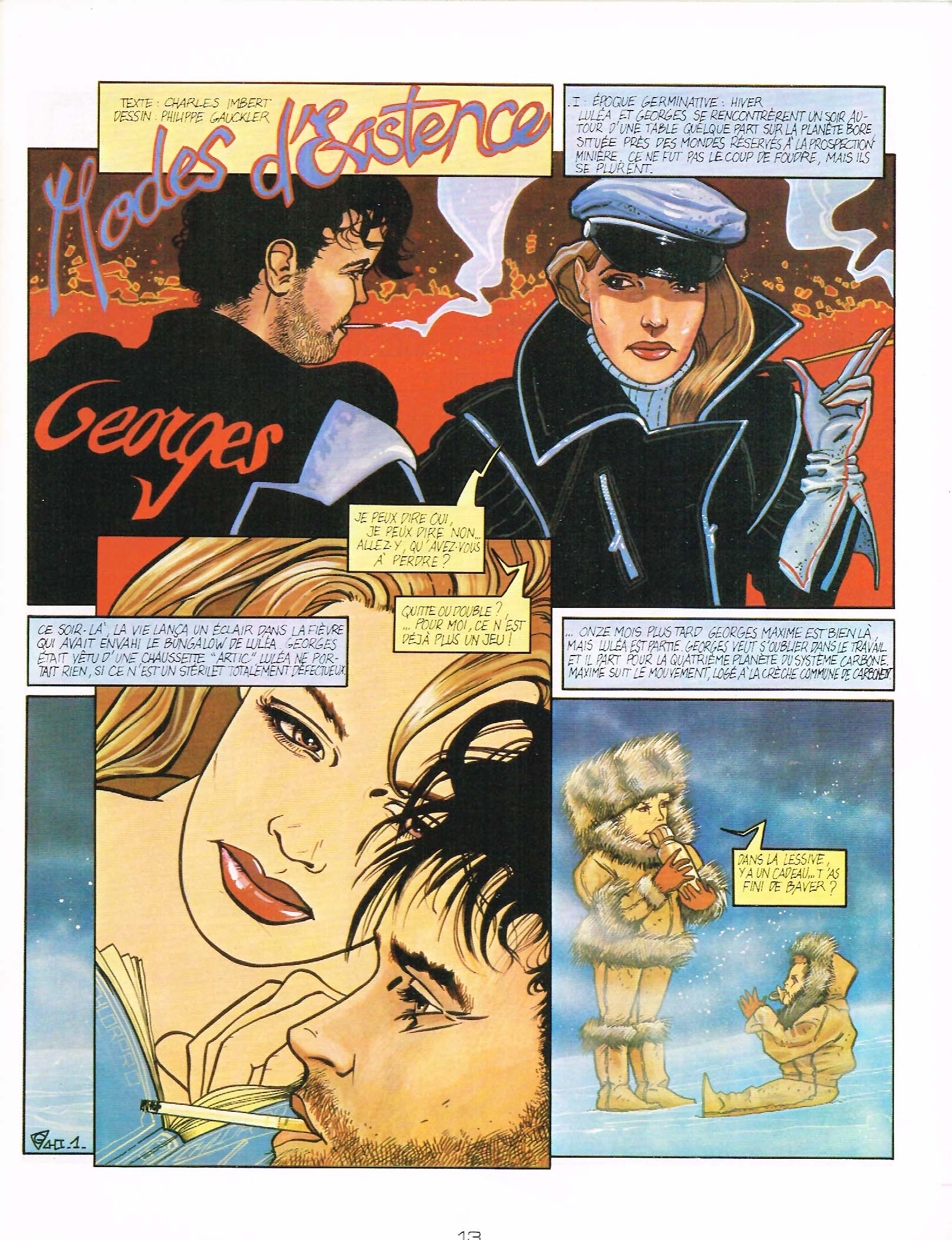 “Mode d’Existence” (MH 94, p. 13, 6 pages) semble faire suite à “Libre Entreprise” (MH 73). L’histoire nous offre un monde de colonies spatiales dans des systèmes lointains. L’ensemble apparait un peu saccadé et confus. On y retrouve de très beau designs de personnages, particulièrement les détails des vêtements et des maquillages.