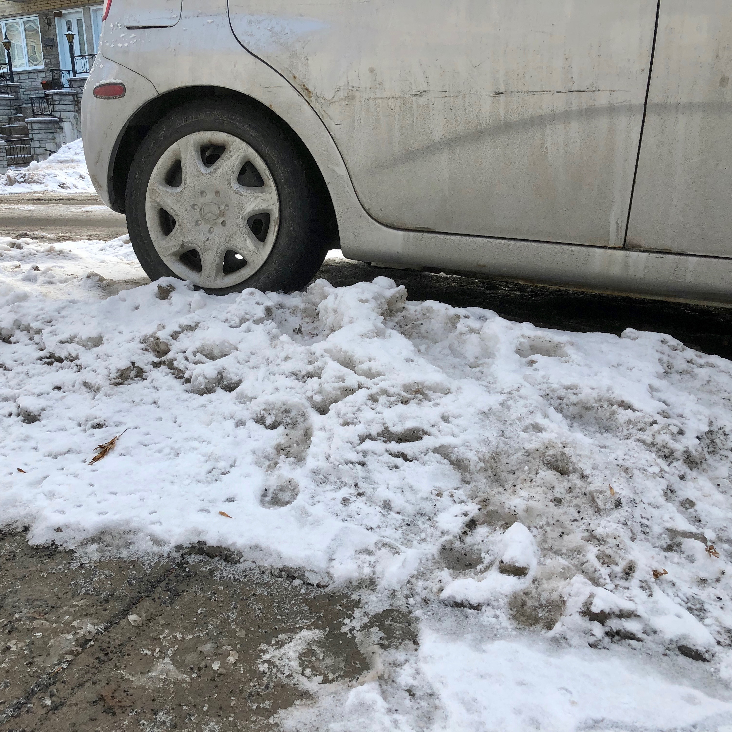 Comment vous appelez ça devoir se stationner 2 pieds dans les air sur une pile de glace pcq la neige a pas encore été ramassé une seule fois depuis le début de l’hiver? C’est beau économiser un peu d’argent mais tout même! Et on parle pas des trottoirs casse-gueule…