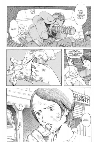 Dans “On the frontier” (辺境で / Henkyō de, 42 pages), des hommes travaillent dure à la construction d’un chemin de fer dans un pays désertique mais froid qui n’est pas nommé (possiblement en Amérique du Sud?). Il s’agit d’une dictature où la guérilla fait rage. Les accidents de construction ne sont pas rares et souvent ils sont mortels. Un jeune se joint à l’équipe. C’est en fait un journaliste incognito mais il est découvert et exécuté… Toutefois, le contre-maître voit à le venger. Pré-publié dans Big Comic Spirits Casual (mai 2007) et lauréat du 59e prix Shinjin Komikku Taishô de Shōgakukan (débutant, catégorie seinen). J’aime bien.