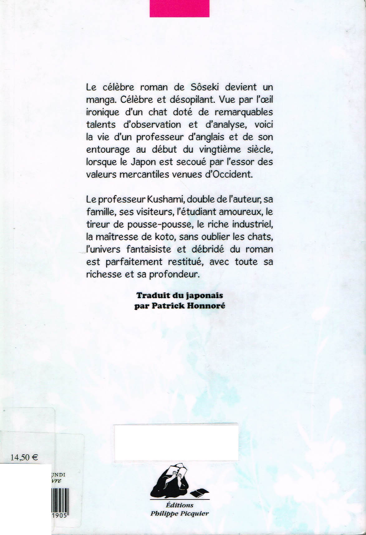 9782809711905_pgKushami est professeur de littérature anglaise à l’ère Meiji et tout un monde orbite autour de lui: ses étudiants (Meitei, Kangetsu), ses amis, sa famille, ses voisins. Le témoin de cette vie quotidienne est un chat sans nom, qui prends ici la place d’un narrateur omniscient. Il s’agit d’un récit satirique, qui parodie la classe moyenne japonaise ayant adopté tant bien que mal les coutumes de l’occident et qui se prends des airs arrogants. Une bonne partie de l’intrigue se déroule autour des spéculations sur le possible marriage de Kangetsu avec Tomiko, la fille des Kaneda — un riche marchand. Malheureusement, l’histoire finit mal pour le chat…