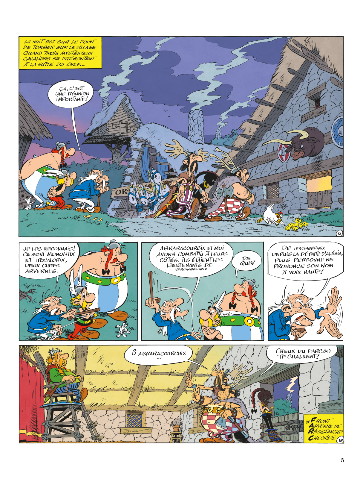 C’est cette fois au Village que nous retrouvons nos héros préférés, qui nous prouvent une fois de plus qu’il n’est nul besoin de traverser le monde pour vivre de palpitantes péripéties. Effervescence et chamboulements en perspective ! La fille du célèbre chef gaulois Vercingétorix, traquée par les Romains, trouve refuge dans le Village des irréductibles Gaulois… Et le moins que l’on puisse dire, c’est que la présence de cette ado pas comme les autres va provoquer moults bouleversements intergénérationnels…” [Texte du site de l’éditeur]