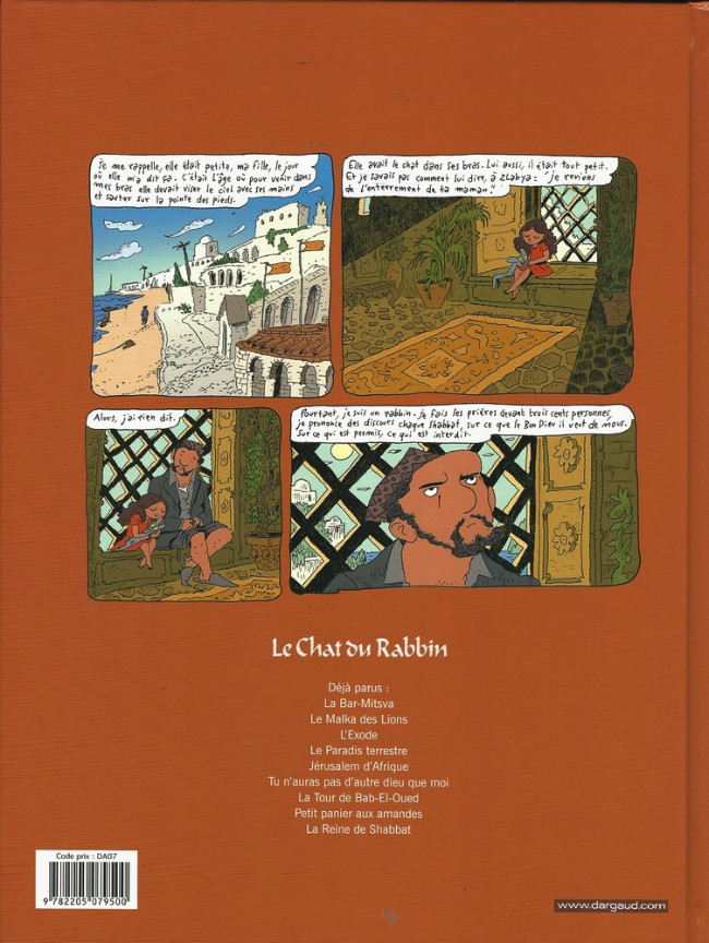 J’avais trouvé les derniers albums un peu décevants mais celui-ci nous offre à nouveau un récit fort, intéressant, intriguant et divertissant. Par contre, j’ai toujours des réserves quand au style de Sfar, caractérisé par les planches à six cases (il s’y tient les trois-quart de l’album), son dessin ondulant qui donne aux planches une apparence un peu brouillonne et criarde, de même que le texte des bulles parfois difficile à déchiffrer. Mais, bon, c’est son style: avec le temps on s’y habitue et ce n’est plus une distraction. Ses histoires sont suffisamment enrichissantes et amusantes pour qu’on lui pardonne cet écart.