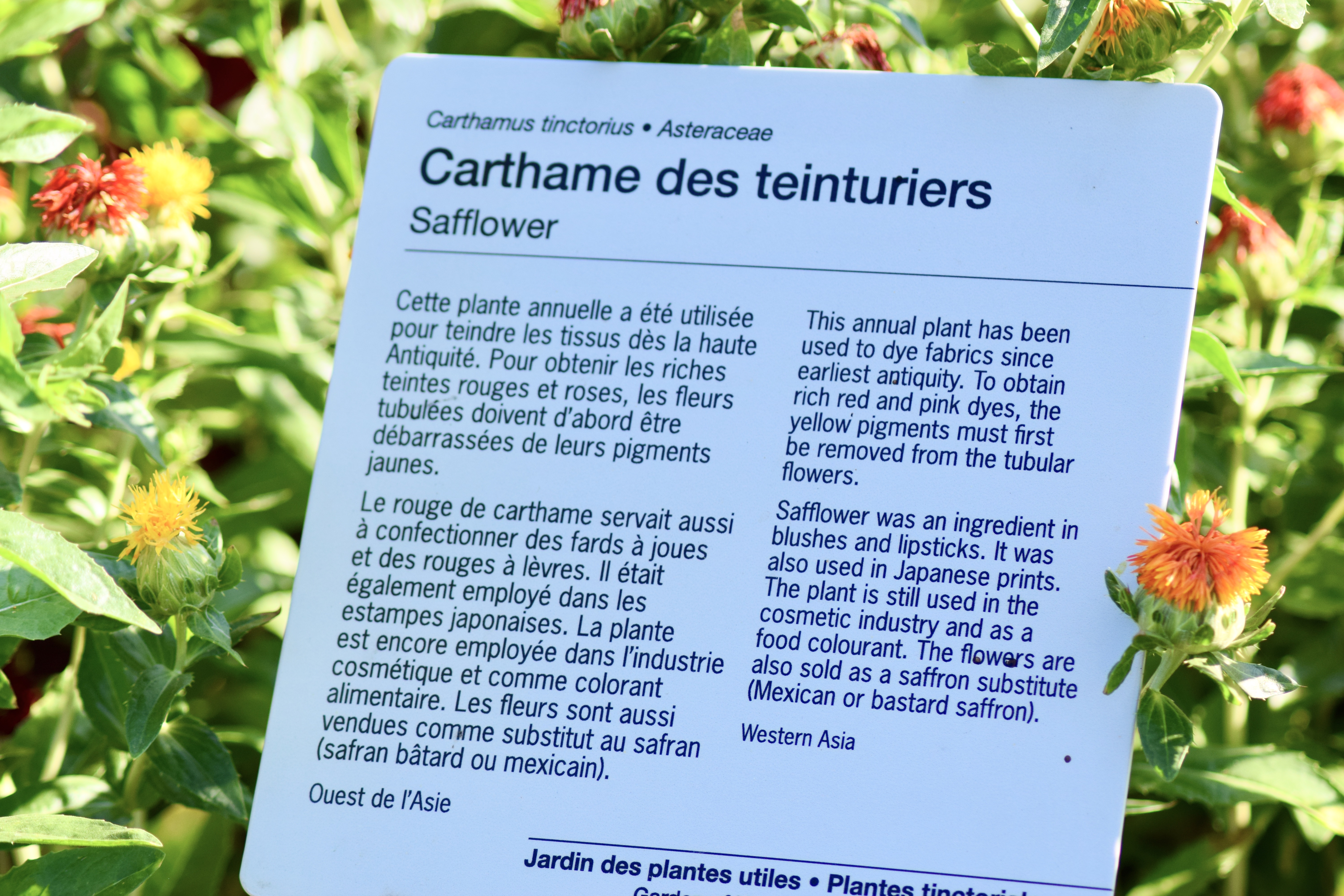 Il n’y a pas grand chose à rajouter à cette fiche signalétique exhaustive (ci-contre). Le Carthame des teinturiers (Safflower en anglais) est une plante à fleurs de la famille des Asteraceae et du genre Carthamus. Originaire d’Égypte, elle a de nombreuses propriétés surtout tinctoriale et oléagineuse, mais aussi culinaires. [ Translate ]