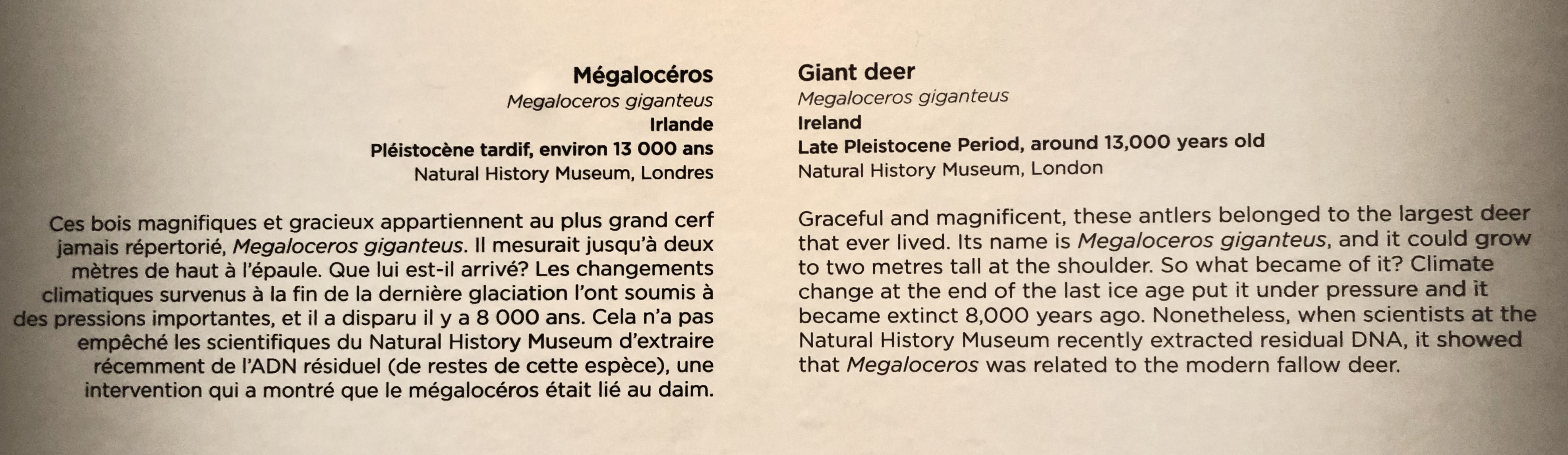 Selon la fiche signalétique, ce gigantesque panache appartient à la plus large espèce connue de cerf (sa taille à l’épaule pouvait mesurer jusqu’à deux mètres!) qui a disparue à la fin de la glaciation il y a huit millénaires et qui serait l’ancêtre du daim.