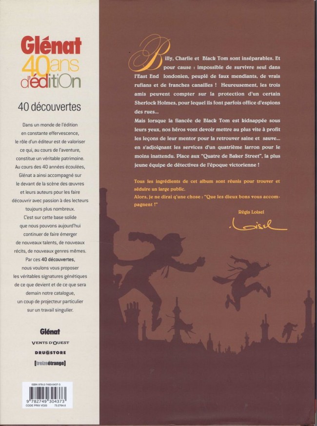 Billy, Charlie et Black Tom sont inséparables. Et pour cause : impossible de survivre seul dans l’East End londonien, peuplé de faux mendiants, de vrais ruffians et de franches canailles ! Heureusement, les trois amis peuvent compter sur la protection d’un certain Sherlock Holmes, pour lequel ils font parfois office d’espions des rues… Mais lorsque la fiancée de Black Tom est kidnappée sous leurs yeux, nos héros vont devoir mettre au plus vite à profit les leçons de leur mentor pour la retrouver saine et sauve… en s’adjoignant les services d’un quatrième larron pour le moins inattendu. Place aux Quatre de Baker Street, la plus jeune équipe de détectives de l’époque victorienne !”
