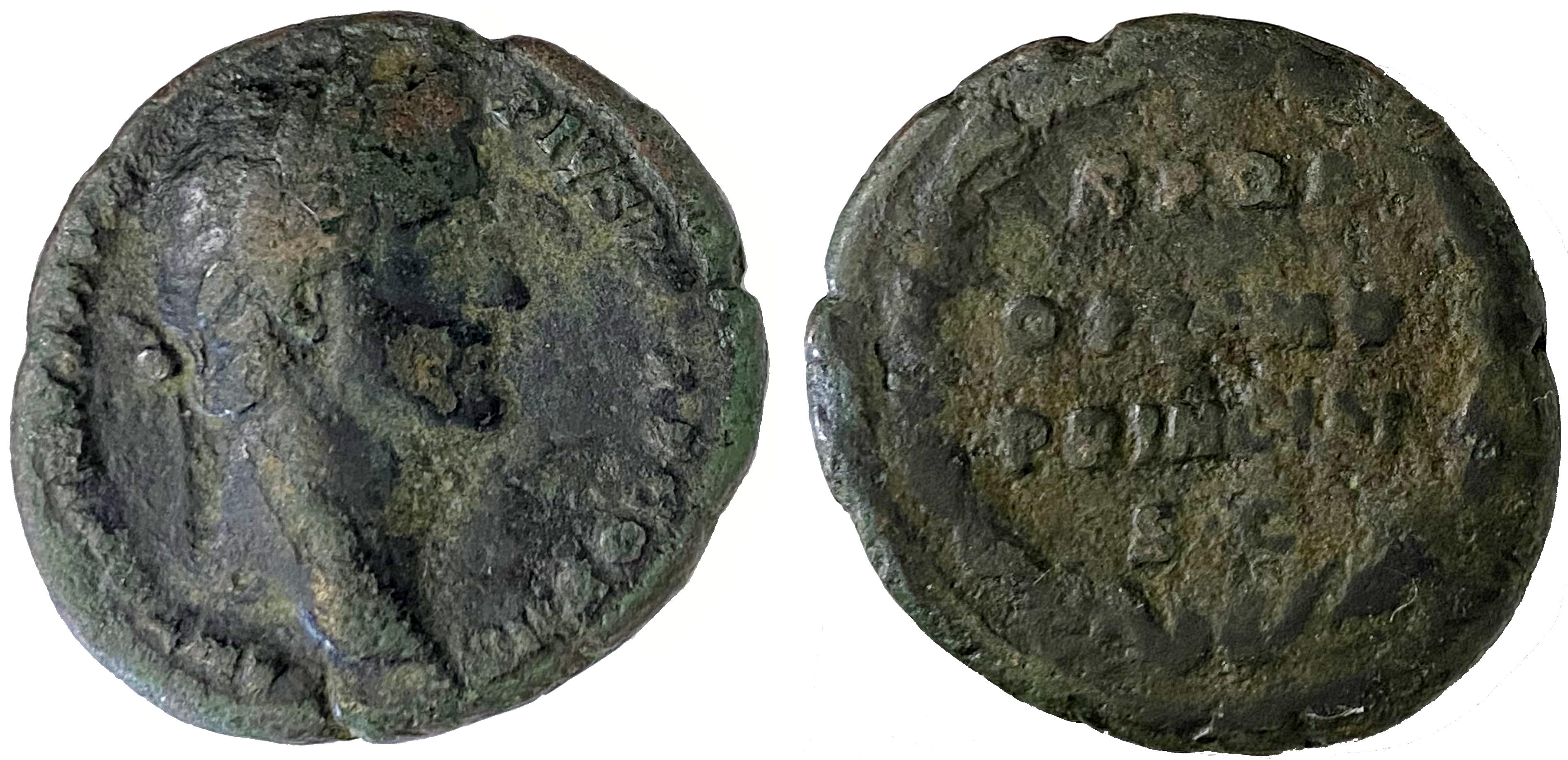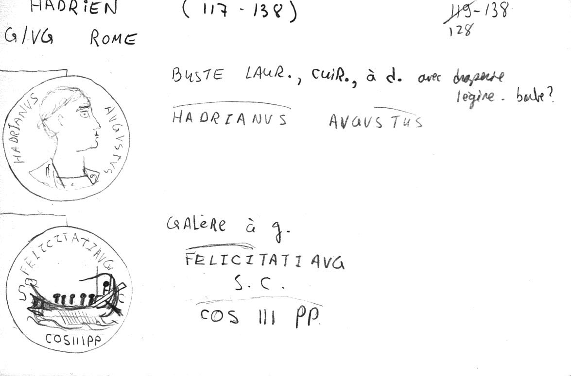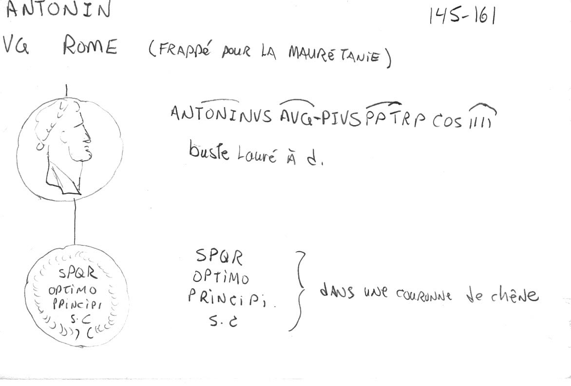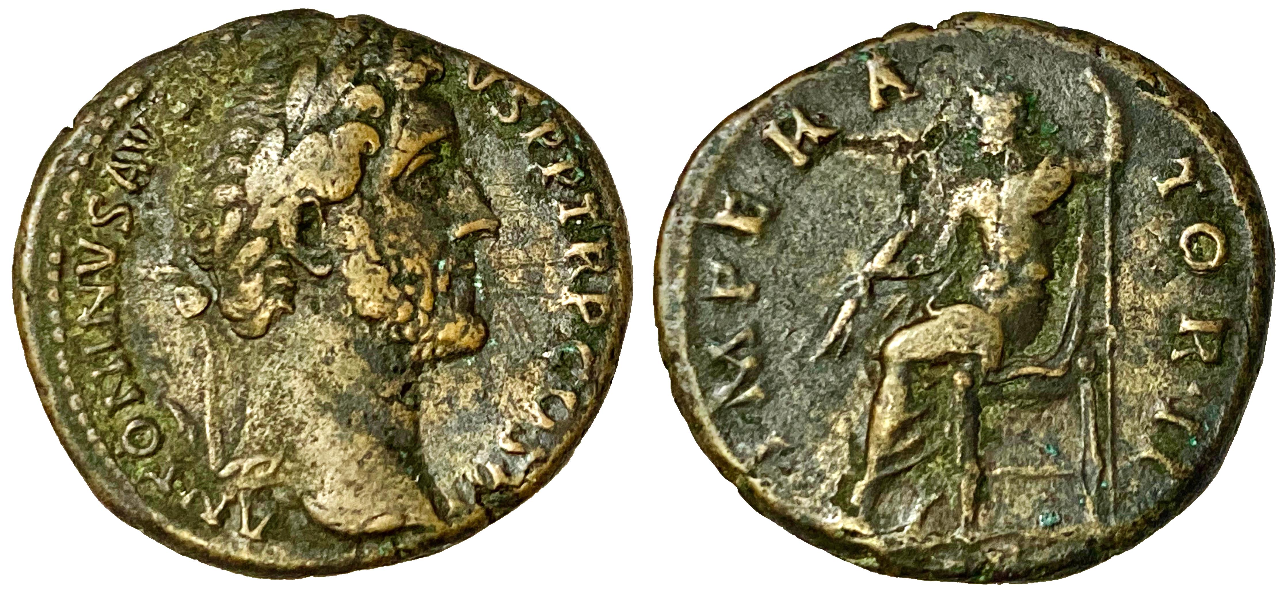 Il est important de noter que je n’ai trouvé dans les références aucunes autres pièces qui correspondent exactement à ce sesterce. Toutes les variantes présentent sur cette pièce se retrouvent sur d’autre types mais jamais ensemble. Et je suis pas mal sûr de ne pas me tromper: la tête de Marcus est bel et bien laurée car on voit clairement les lauriers qui dépassent sur le dessus de sa tête et les cordons qui l’attachent derrière. On voit aussi clairement un drapé sur son épaule. Les titulatures datées (TR P XV, COS III) sont également sans ambiguïté. Et cette pièce, par son poids et sa taille, est définitivement un sesterce. Pourtant, dans les références, je ne retrouve ce type de pièce qu’avec la tête nue (non laurée), avec un différent revers (où les empereurs sont assis et non debout), avec une autre date (TR P XVI) ou sur un as. Ma pièce serait-elle rare ?