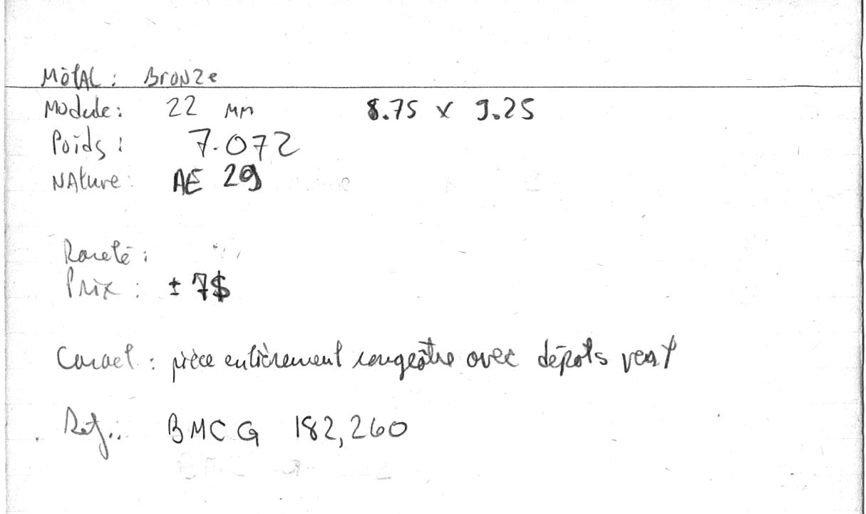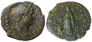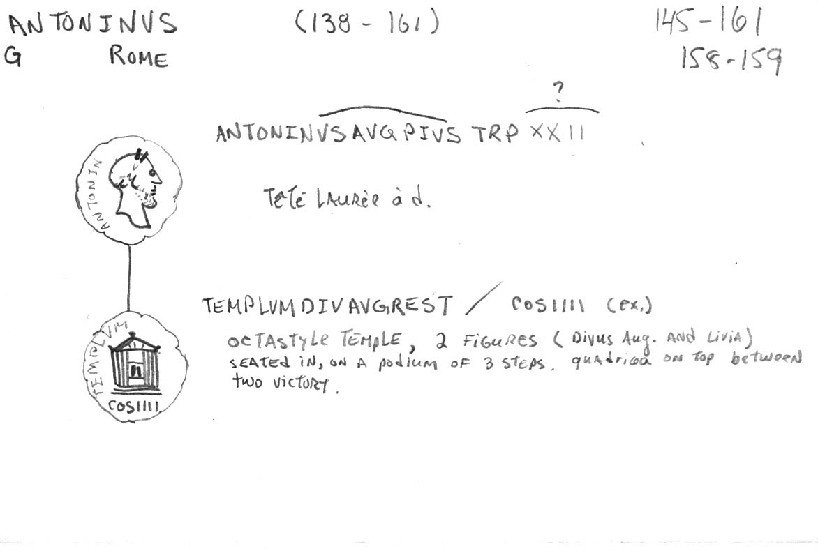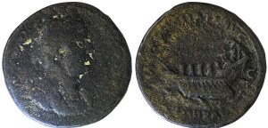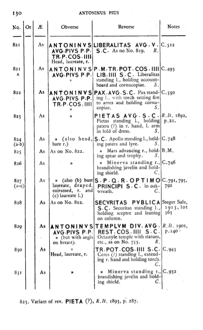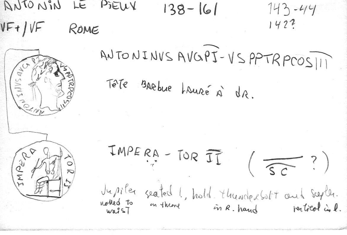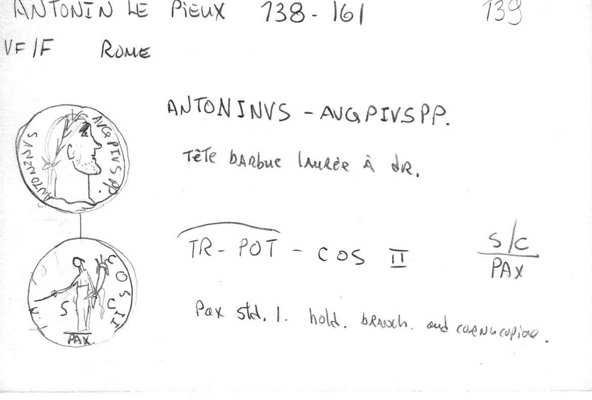 Il est important de noter que je n’ai trouvé dans les références aucunes autres pièces qui correspondent exactement à ce sesterce. Toutes les variantes présentent sur cette pièce se retrouvent sur d’autre types mais jamais ensemble. Et je suis pas mal sûr de ne pas me tromper: la tête de Marcus est bel et bien laurée car on voit clairement les lauriers qui dépassent sur le dessus de sa tête et les cordons qui l’attachent derrière. On voit aussi clairement un drapé sur son épaule. Les titulatures datées (TR P XV, COS III) sont également sans ambiguïté. Et cette pièce, par son poids et sa taille, est définitivement un sesterce. Pourtant, dans les références, je ne retrouve ce type de pièce qu’avec la tête nue (non laurée), avec un différent revers (où les empereurs sont assis et non debout), avec une autre date (TR P XVI) ou sur un as. Ma pièce serait-elle rare ?