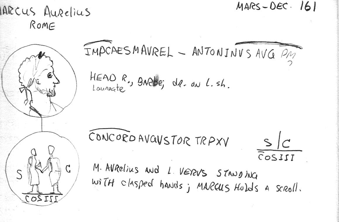 La titulature des inscriptions nous permet une datation assez précise. Sur l’avers on retrouve IMP[ERATOR] CAES[AR] M[ARCVS] AVREL[IVS] – ANTONINVS AVG[VSTVS] P[ONTIFEX] M[AXIMVS]. Le revers ajoute CONCORD[IA] AVGVSTOR[VM] TR[IBUNICIA] P[OTESTE] XV, avec un S[ENATUS] C[ONSULTO] de part et d’autre du champ et un CO[N]S[VL] III en exergue. Marcus a reçu le titre de césar lors de son adoption en 138. Il reçoit la puissance tribunicienne pour la quinzième fois le 10 décembre 160 et son troisième consulat en janvier 161. Les autres titres (Auguste, Imperator et Grand Pontife) lui sont attribués lors de son accession au pouvoir le 8 mars 161. La puissance tribunicienne étant attribuée annuellement le 10 décembre de chaque année, la pièce a donc été frappée entre mars et décembre 161.