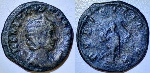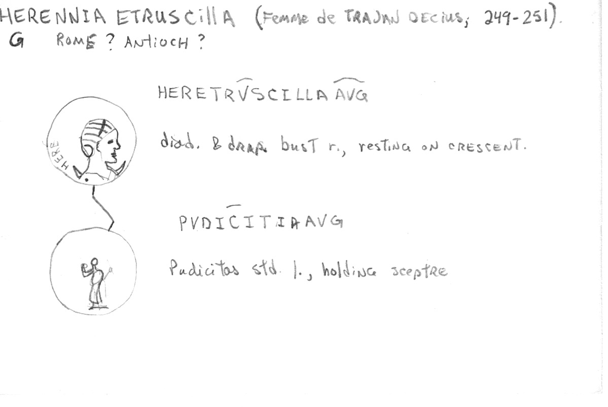 Herennia Etruscilla, dont je n’ai qu’une seule pièce de monnaie, était l’épouse de Trajan Decius (possiblement marié vers 230), qui règna de l’automne 249 à juin 251, pendant l’anarchie militaire qui suivi la dynastie des Sévères. Les sources sont pauvres à cette époque et on connait donc peut de choses d’elle. Elle serait d’une vieille famille sénatoriale italienne (possiblement d’une origine étrusque). Elle reçoit le titre d’Augusta lors de l’accession au pouvoir de son époux en 249. Elle a participé au pouvoir puisqu’elle gérait les affaires de l’Empire durant les campagnes militaires de Decius (et même, plus tard, comme régente d’Hostilianus). Son fils Herennius Etruscus fut très brièvement co-empereur (en mai et juin 251) aux côtés de son père mais tous les deux meurent durant la bataille d’Abrittus, alors qu’ils défendaient la frontière danubienne contre des envahisseurs Goths. Le gouverneur de Mésie, Trebonianus Gallus, est proclamé empereur par les troupes et succède à Decius. Elle leur survit et continue même d’être associé au pouvoir puisque son second fils, Hostilianus qui n’a que treize ans, est fait co-empereur de Trebonianus Gallus et que sa fille aurait possiblement été mariée au fils de Trebonianus, Volusianus. Etruscilla serait peut-être morte de la peste qui a aussi emporté Hostilianus en novembre 251 — quoiqu’il en soit, elle sombre dans l’obscurité après cette date. Elle demeure néanmoins un bon exemple de femmes romaines fortes qui ont joué un rôle politique.