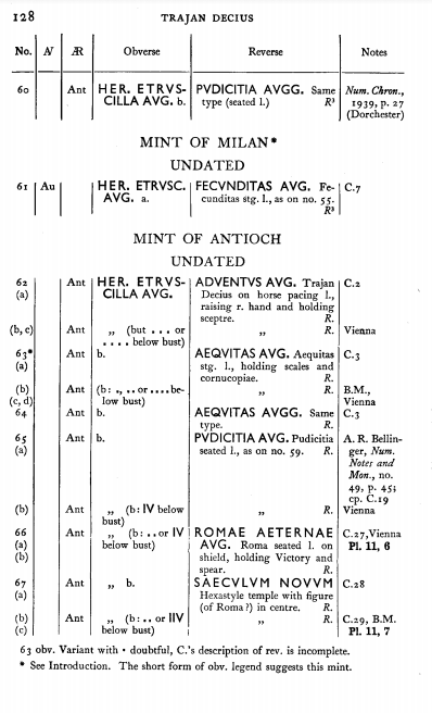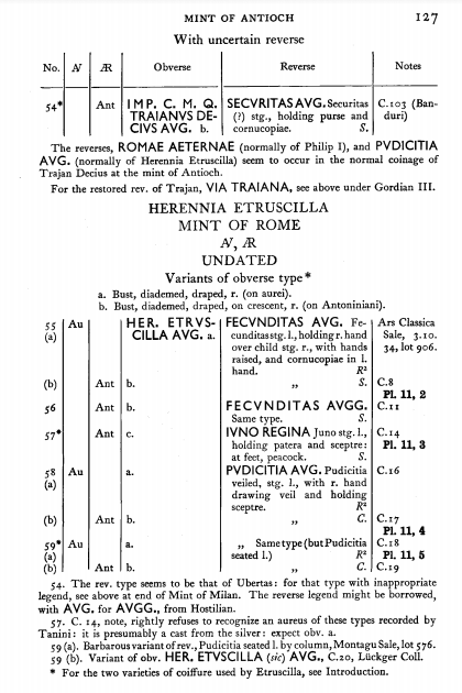 Sources: Wikipedia, Sear RCV (1983): 2630, RIC IV Part 3: 58b, Sear RCV [M. Ed.]: 9494, C 17, CoinArchives, CoinArchives, CoinProject, Wildwinds, vcoins, vcoins, cointalk, numiscmatics, coincommunity, acsearch, deamoneta, ERIC, FAC (Etruscilla, Antioch officinae, PUDICITIA AVG, Pudicitia). Voir aussi ma fiche.