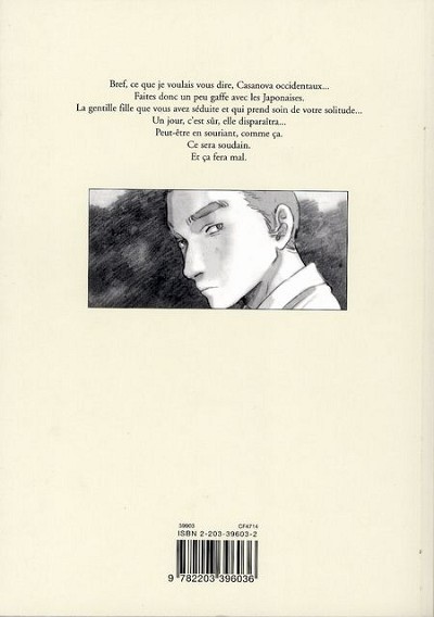 “Bref, ce que je voulais dire, Casanova occidentaux… Faites donc un peu gaffe avec les Japonaises. La gentille fille que vous avez séduite et qui prends soin de votre solitude… Un jour, c’est sûr, elle disparaîtra… Peut-être en souriant, comme ça. Ce sera soudain. Et ça fera mal.