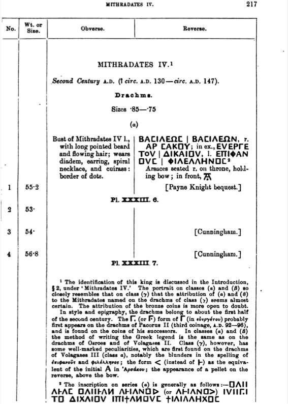- Wroth, W. Catalog of Coins in the British Museum – Parthia (Greek Coins, vol. 23). London, 1903. [BMC 23]