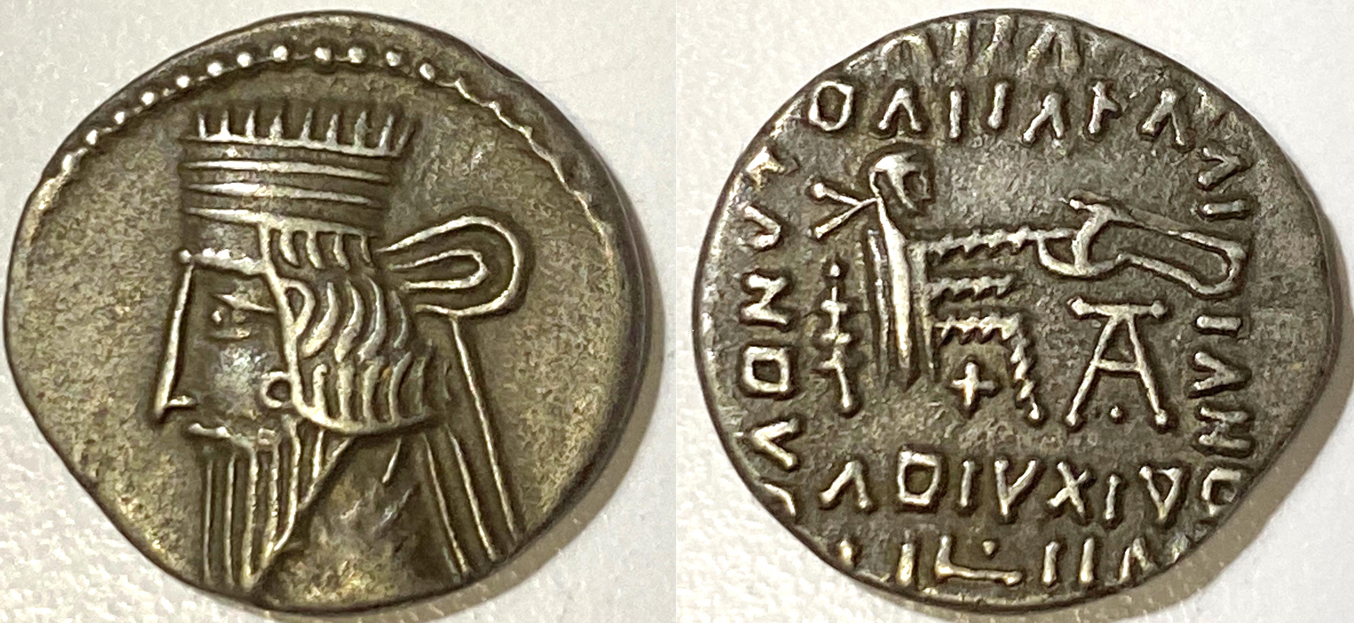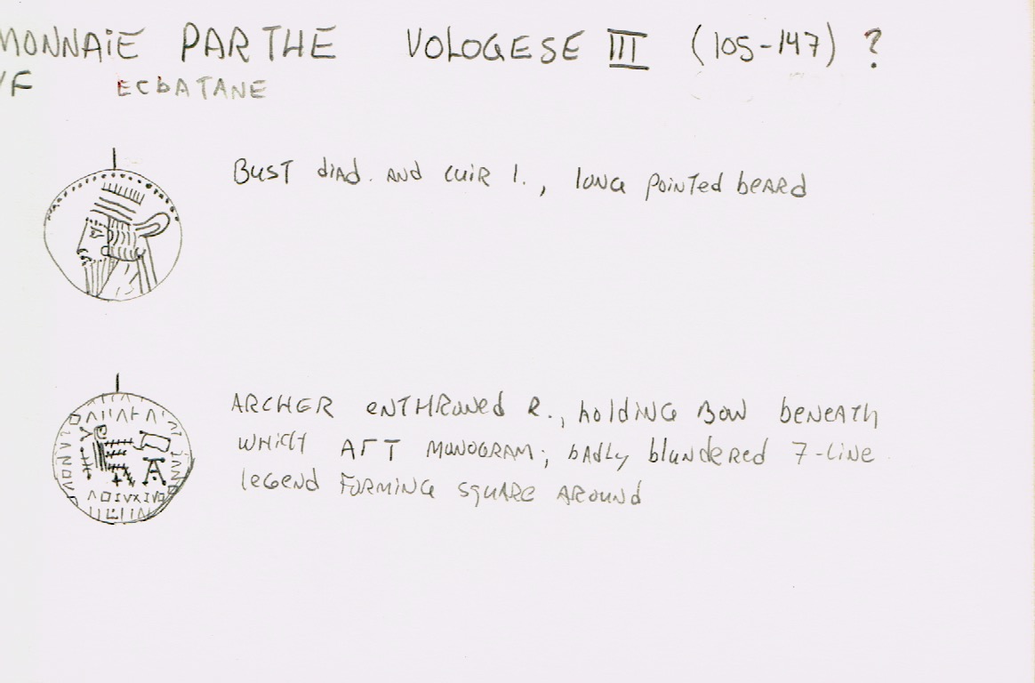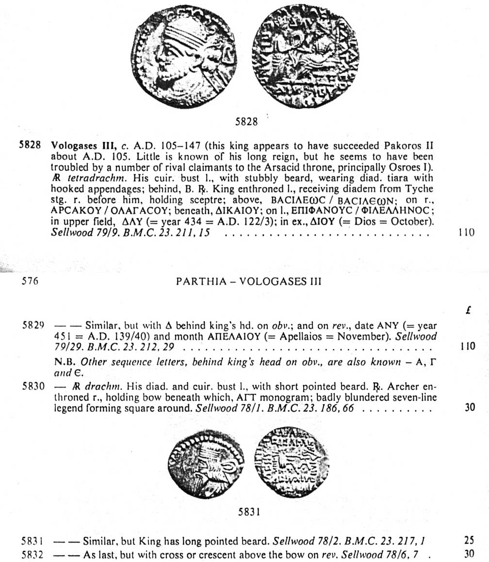Sources: Wikipedia [Empire Parthe, Monnaie Parthe, Vologèse FR / EN; note: il y a une différence importante entre les deux versions!], Google, Sear GIC 5830/31; BMC 23.186,66/72, BMC 23.217,1; Sellwood 78; MA-Shop, MA-Shop, CoinArchives, CoinsHome, Parthika, Parthika (Types S.73 à 81), FAC (Parthia, Parthian Coins, Doug Smith’s Parthian Silver Drachms), Parthia (Parthian Coins, Identification, Monograms, Inscriptions, Vologases III). Voir aussi ma fiche.