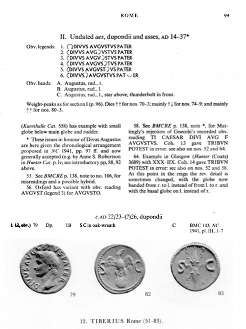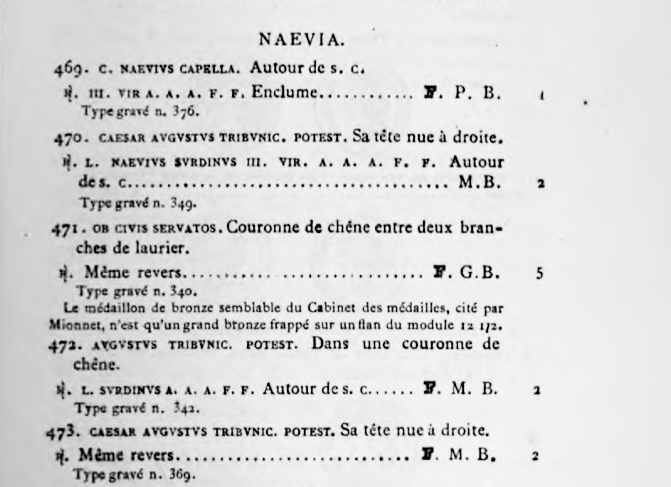 IMG_8545-8546Ce très bel as impératorial d’Auguste (F [Fine], Ae [Bronze], 26 mm, 9.942 g, acheté à Paris le 1986/02/07 pour 80 FF [± $16]; Die-axis: ↑↘︎) présente sur l’avers la tête nue de l’empereur à droite avec l’inscription TRIBVNIC[IA] POTEST[AS] • CAESAR AVGVSTVS. Le revers n’offre qu’un large S[ENATVS] • C[ONSVLTO] (“avec la permission du Sénat”) entouré de l’inscription L SVRDINVS III VIR AAA FF. Comme je l’ai déjà expliqué avec les pièces républicaines, à cette époque les pièces étaient encore frappées au nom du (ou des) magistrat monnayeur, qui était appelé triumviri monetales (abrégé III VIR) car ils étaient au nombre de trois. Leur titre était tres viri aere argento auro flando feriundo (abrégé III VIR AAAFF), ce qui signifiait “les trois hommes [chargés de] la préparation et la frappe des pièces de bronze, d’argent et d’or”. Dans ce cas-ci, il s’agit du triumvirat monétaire composé de CN F Piso, C Plotinus Rufus et de Lucius Neavius Surdinus. Sur ce dernier, nous savons seulement qu’il a été consul suffectus en 30, triumvir monetalis en 15 et préteur c. 10 (car une inscription commémore le fait qu’il ait fait refaire le pavé du forum). Cette pièce date définitivement d’après 23 AEC (date où Augustus a reçu la puissance tribunitienne) mais la date où a officié Surdinus varie selon les sources: on la place entre 23 et 9 AEC — Karl Pink la situe en 20 et le RIC en 15 AEC. Les sources récentes semblent toutefois tous s’entendre sur cette dernière date. Sources: Wikipedia, RIC I: 386, Cohen 473, CoinArchives, Numismatics, Numismatics, AncientCoins, acsearch, catawiki, vcoins, Wildwinds, FAC (Augustus, III VIR A A A F F);  Pannekeet, C. The moneyers issues under Augustus; Pink, Karl. The Triumviri Monetales and the structure of the coinage of the Roman Republic. (Numismatic Studies #7). NY, American Numismatic Society, 1952 (page 46). Voir aussi ma fiche.