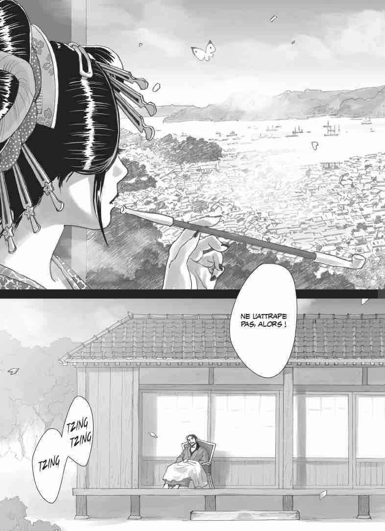 Le dernier envol du papillon nous offre une très belle histoire d’amour. Le récit est plutôt fluide et l’intrigue autour de Kicho nous tiens en haleine. C’est intéressant car les récits de courtisanes (comme Sakuran de Moyoco Anno) se déroulent généralement à Edo. Le dessin est agréable et détaillé (Takahama utilise beaucoup de trames très fines pour les dégradés). On voit que l’artiste gagne en assurance (c’est son huitième manga, publié juste après Tokyo, amour et libertés) et qu’elle a beaucoup recherché son sujet. C’est ce qui rend d’ailleurs ce manga très intéressant car elle dépeint bien la société et les moeurs de l’époque, un moment fascinant de l’Histoire japonaise qui fait la transition entre le shogunat Tokugawa (bakufu) et le japon moderne qui débute avec l’ère Meiji. C’est une très bonne lecture que je recommande, mais pour adultes car il contient, bien sûr, beaucoup de nudité et de sexualité (comme dans les autres productions récentes de Takahama).