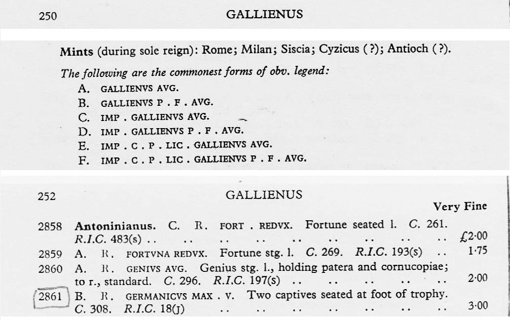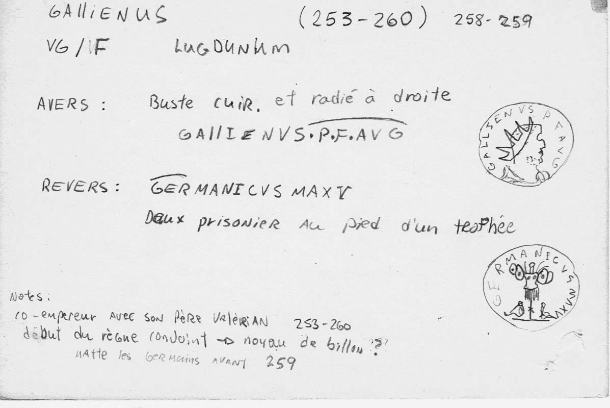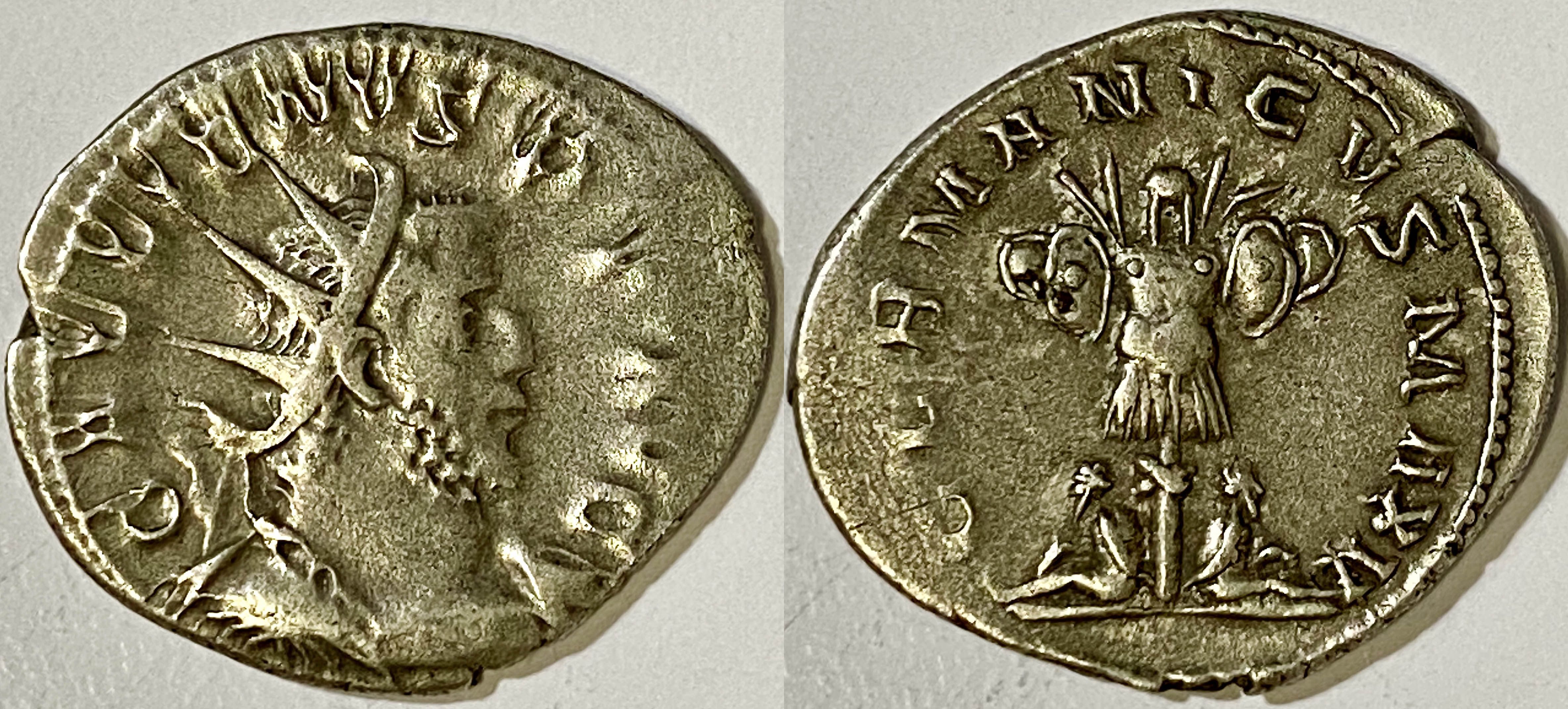Sources: Wikipedia (Gallienus [FR/EN], tropæum [FR/EN]), Google, FAC (Gallienus), ERIC (Gallienus); RIC vol V, pt 1: 18j, Sear RCV (1983): 2861; CoinArchives, WildWinds (1: text/image, 2: text/image, 3: text/image, 4: text/image, 5: text/image), CoinTalk, BeastCoins, acsearch, vcoins, vcoins, numista, arc, numismatics, CoinProject, ancientcoins. Voir aussi mes fiches (fiche 1 et fiche 2).