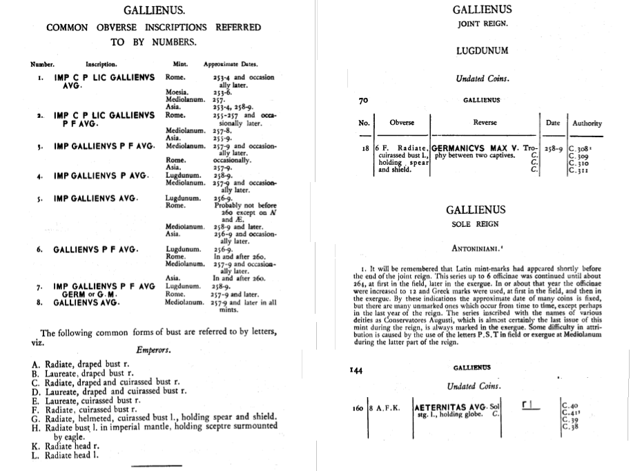 Sources: Wikipedia (Gallienus, Sol), Google, FAC (Gallienus, Aeternitas, Aeternitas Aug, Sol, catalog), ERIC (Gallienus); RIC vol V, pt 1: 160; numista, CoinProject (1, 2, 3, 4, 5, 6, 7, 8), WildWinds (1: text/image, 2: text/image, 3: text/image), vcoins, coinstree, CoinTalk, MA-Shops, numismatics. Voir aussi ma fiche.