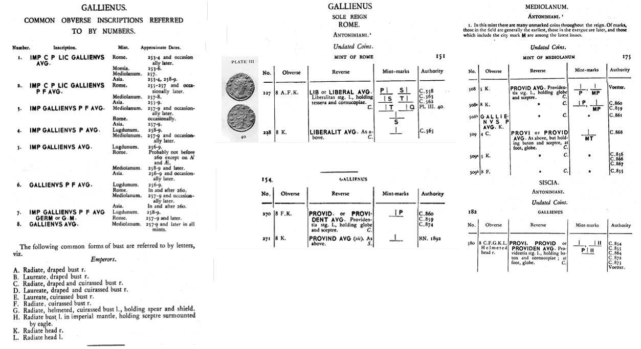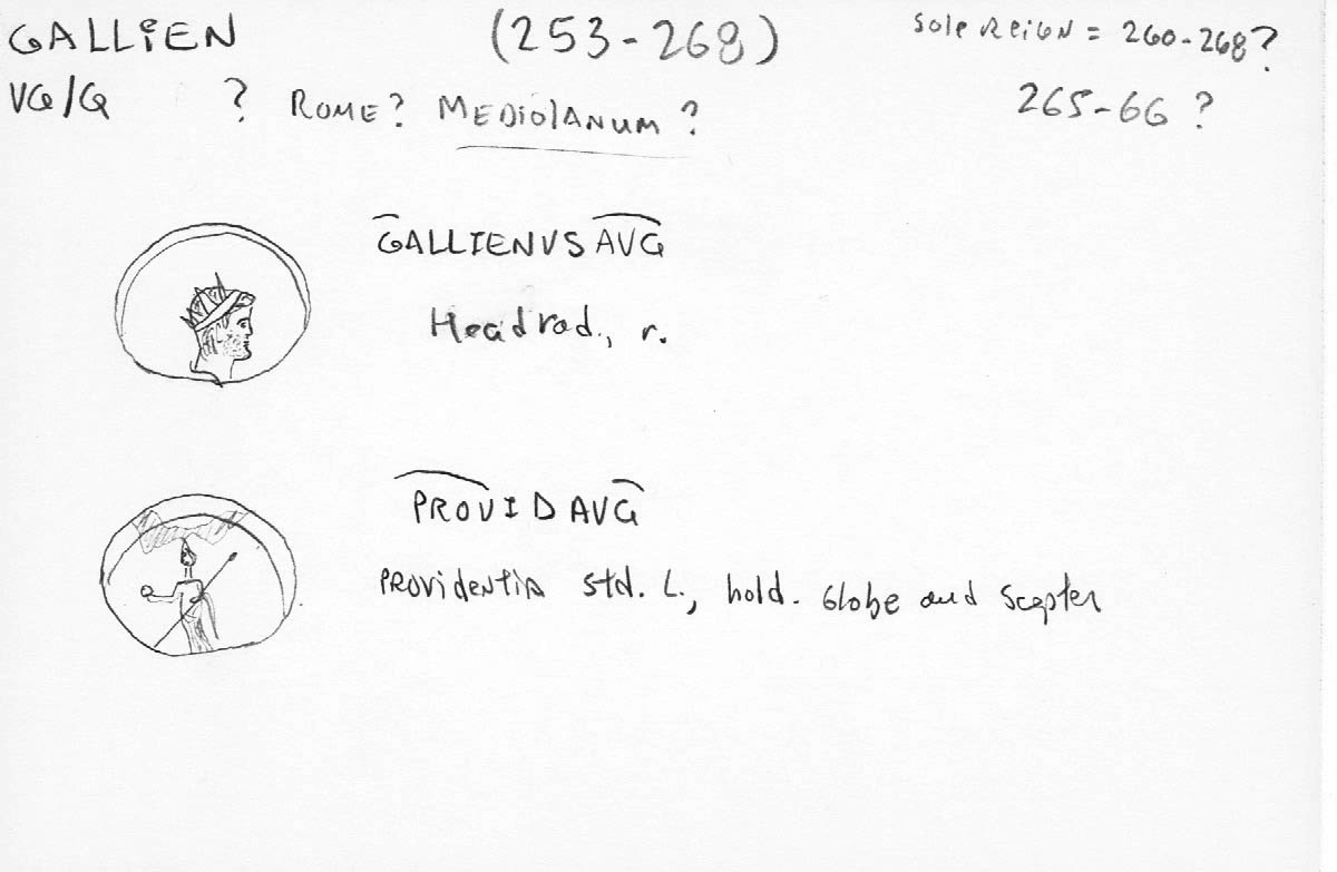 Sources: Wikipedia (Gallienus, Providentia [FR/EN]), Google, FAC (Gallienus, Providentia), ERIC (Gallienus); RIC vol V, pt 1: 270 / 508a, Sear RCV (1983): 2888; CoinArchives, Numismatics, WildWinds (RIC 270: text, image; RIC 508: text, image),  bnumis, CoinProject, MA-Shops. Voir aussi ma fiche.