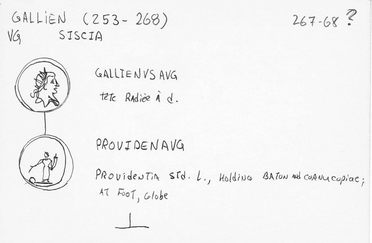 Sources: Wikipedia (Gallienus [FR/EN], Providentia [FR/EN]), Google, FAC (Gallienus, Providentia, Siscia), ERIC (Gallienus); RIC vol V, pt 1: 580; vcoins, WildWinds (text/image), bnumis, CoinProject. Voir aussi ma fiche.
