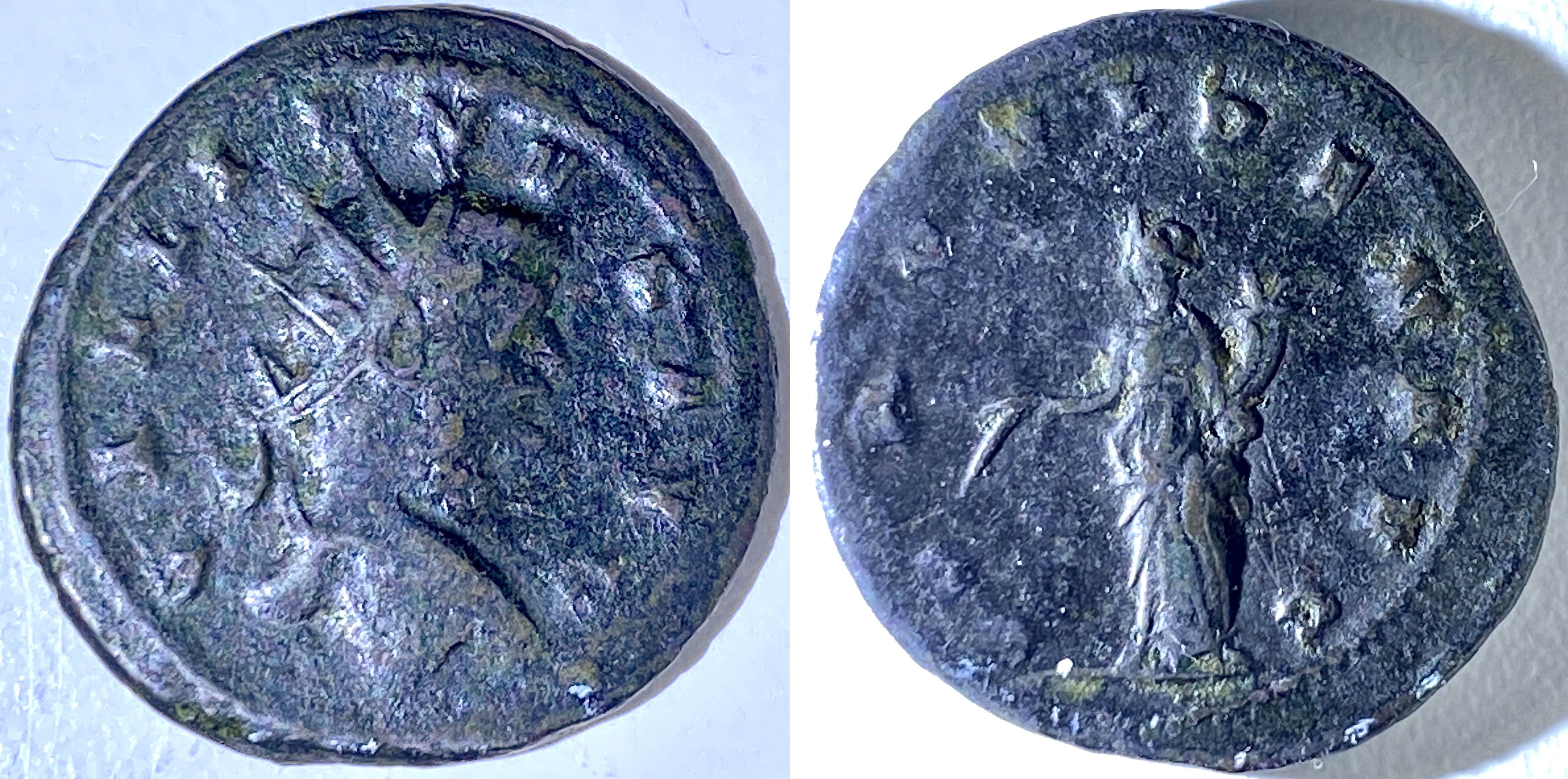 Comme pour les pièces présentées la semaine dernière, celles-ci sont une bonne évidence de la dévaluation monétaire sous Gallienus (voir aussi RIC v. 5 pt 1, pp 7-8). Le coût élevé des campagnes militaires, l’épuisement des mines d’argent et l’émission constante de nouvelle monnaie par une succession d’empereurs et d’usurpateurs causent une importante inflation à laquelle on répond par une dépréciation monétaires et les pièces contiennent donc de moins en moins d’argent. L’antoninianus, qui lors de sa création par Caracalla, contenait 50% d’argent n’en contient plus que 10% au début du règne de Gallienus. On compense en frappant des pièces en billon (ce qui donne un aspect plus terne aux pièces) ou en trichant par l’utilisation de pièces saucées (un flan de bronze est trempé dans une solution d’argent pour lui donner une apparence argenté). Toutefois avec le temps et l’usage ce plaquage tend à disparaître et l’antoninianus prend l’apparence d’une simple pièce de bronze. À la fin du règne de Gallienus, les pièces ont moins de 3% d’argent et cela tombe à près de 1% dans la décennie suivante!