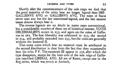 La nomenclature (GALLIENVS AVG) nous indique que la pièce a été frappée durant la période où Gallienus régnait seul, c’est-à-dire après 260. Le RIC (vol V, pt 1: p. 33) nous apprend que ce type de Liberalitas a été frappé seulement à Rome. Il commémore une libéralité, ou distribution d’argent au peuple. Celles-ci eurent lieu en 253, 254, 256 et — la seule du règne de Gallienus — en 263. Ces libéralités sont bien représenté par les attributs de la divinité allégorique: la cornucopiae, qui représente l’abondance, et la tessera, qui est une sorte de planche avec des trous utilisées pour compter rapidement le nombre approprié de pièces à distribuer. Cette pièce a donc été frappée durant le règne unique de Gallienus, à Rome, en 263.