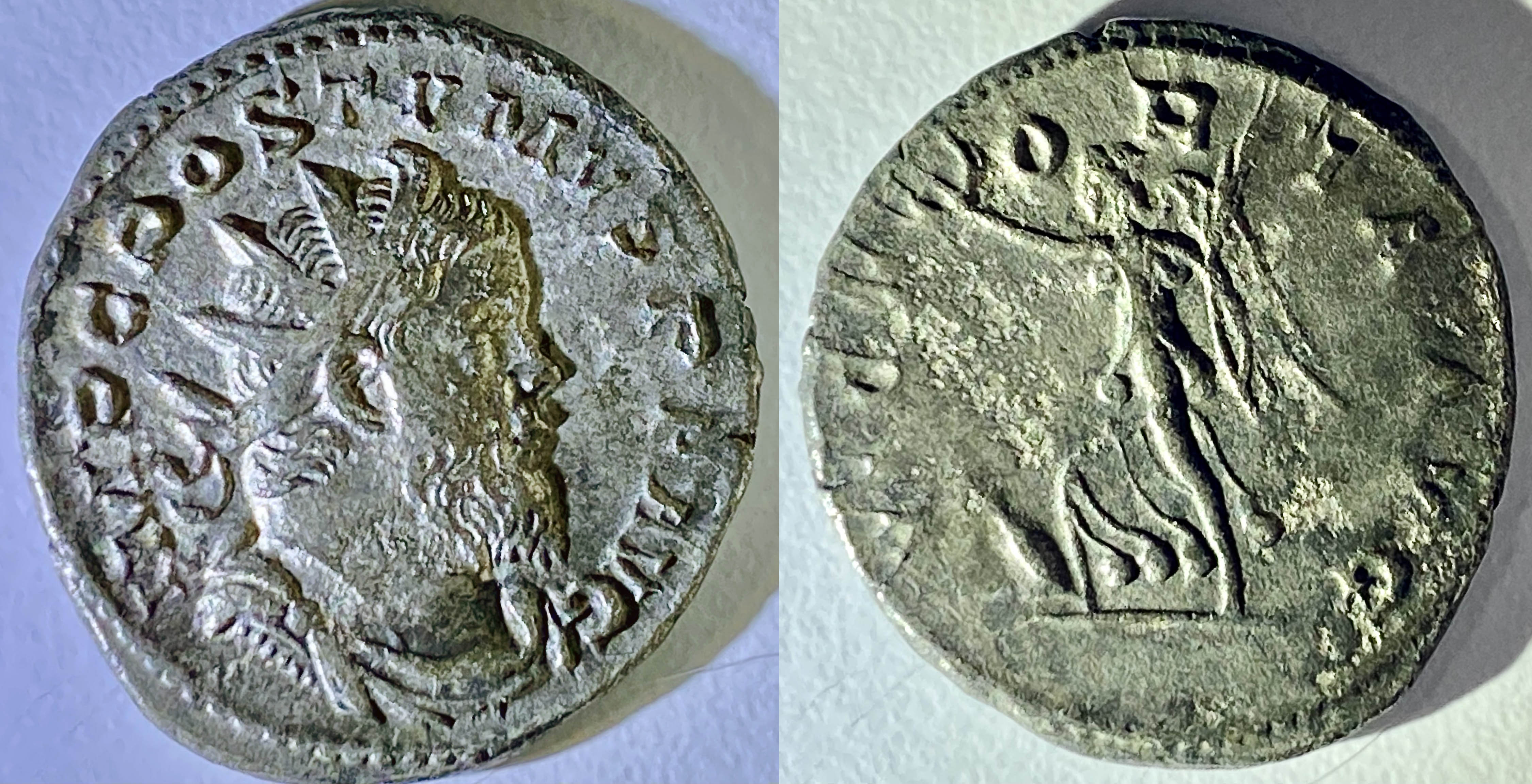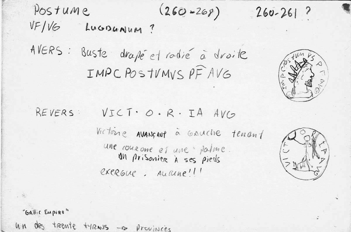 Je n’ai qu’une seule pièce de Postumus et c’est un très beau antoninianus (VF [Very Fine] / VG [Very Good], AR (Billon ou flan de bronze saucé), 21 mm, 3.504 g, payé 95 FF, caractérisé par un très très bel avers mais un revers un peu plus usé et un peu flou, die-axis: ↑↑). L’avers présente une buste de l’empereur radié, drapé et cuirassé à droite avec l’inscription latine IMP[ERATOR] C[AESAR] POSTVMVS P[IVS] F[ELIX] (pieux et heureux) AVG[VSTVS]. Le revers illustre une Victoire ailée avançant à gauche, une couronne de laurier dans la main droite et une palme dans la gauche, un prisonnier à ses pieds, avec l’inscription latine VICT-OR-IA AVG[VSTI] (“Victoire de l’Empereur”).