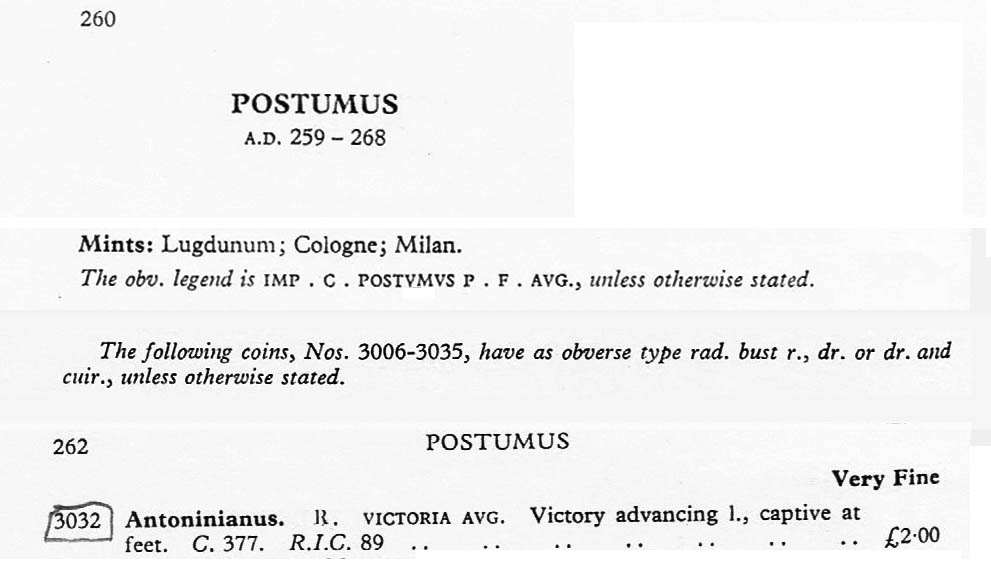 Sources: Wikipedia (Postumus [FR/EN], Empire des Gaule [FR/EN]), Google, FAC (Postumus, VICTORIA AVG, laurel wreath, victory, palm), ERIC (Postumus), GallicEmpire; RIC 5.2: 89, Sear RCV (1983): 3032; CoinArchives, acsearch, arc, WildWinds (text, image), numista, numismatics, vcoins, CoinTalk, FAC, YorkCoins, ACG, WorthPoint, CoinProject. Voir aussi ma fiche.