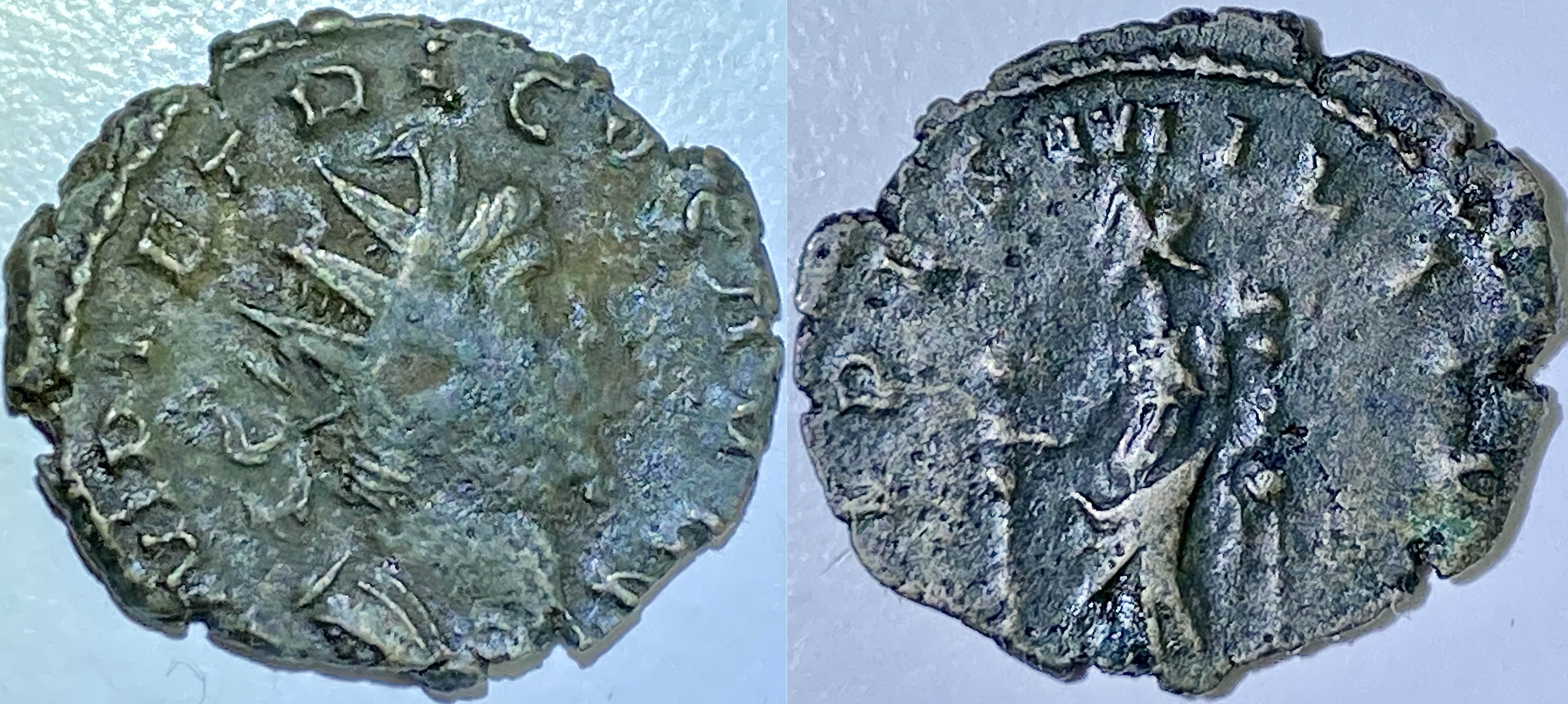 Le revers illustre de façon frappante l’élément le plus important pour le maintient au pouvoir d’un empereur en pleine crise du IIIe siècle: la fidélité des soldats. Le RIC (Webb, Percy H., ed. by Mattingly, H. & Sydenham, E.A. The Roman Imperial Coinage Vol. 5, Part II (From Probus to Maximian). London: Spink & Son, [1933] 1972, pp. 399-425) indique cette pièce comme ayant été frappée dans un atelier du sud de l’Empire des Gaules (et avance Vienne, en Gaule narbonnaise, comme possible localisation) sans donner de datation précise. Toutefois, les sources modernes (en ligne) identifient ce deuxième atelier comme étant plutôt situé à Colonia Agrippinensium (Cologne) et datent la pièce (sans pourtant fournir de justificatif) à 272-73 EC.