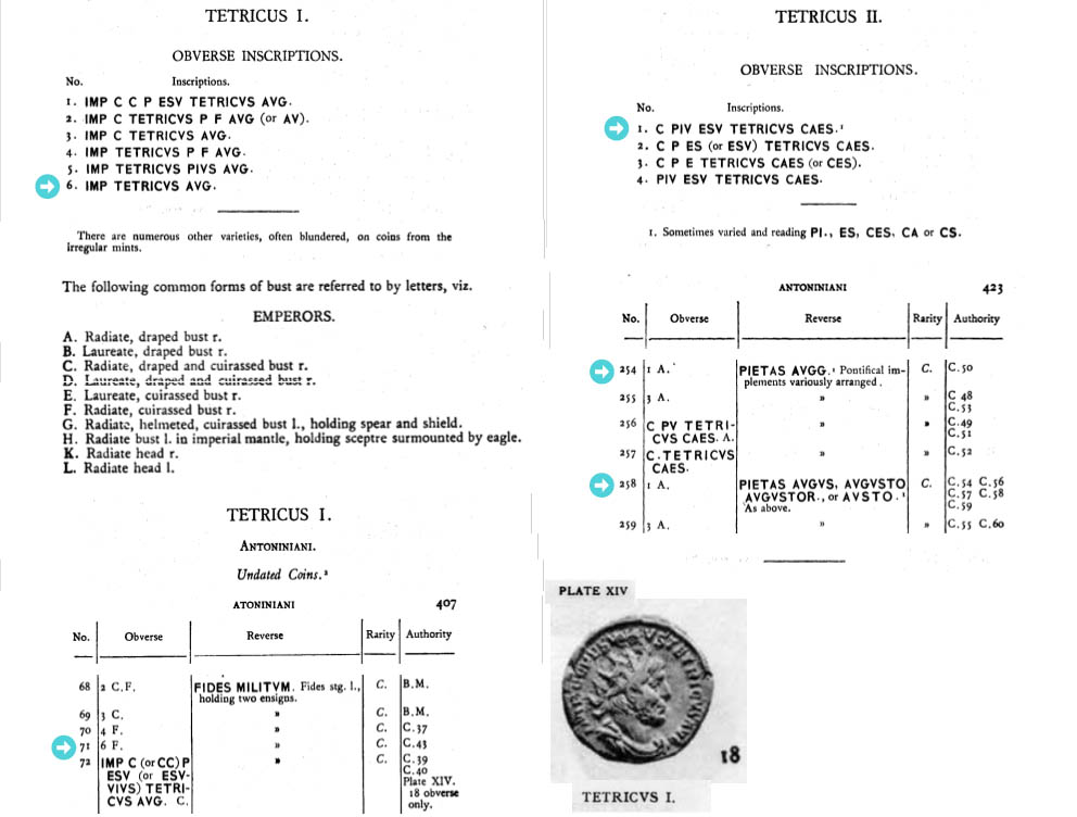 Ici, les co-empereurs veulent de toute évidence promouvoir leur grande piété et ainsi s’attirer les faveurs des dieux (ils en avaient bien besoin!). Tout comme la pièce précédente, le RIC attribut cette pièce au deuxième atelier (que l’on suppose être situé dans le sud, possiblement à Vienne) sans avancer de date précise. Toutefois, les sources modernes (en ligne) identifient ce deuxième atelier comme étant plutôt situé à Colonia Agrippinensium (Cologne) et datent la pièce à 273-74 EC. Dans ce cas-ci on peut facilement justifier cette datation par le fait que Tetricus II aurait reçu le titre de caesar au début de 273 et que son principat prit fin avec l’avénement d’Aurelianus à la fin de 274.