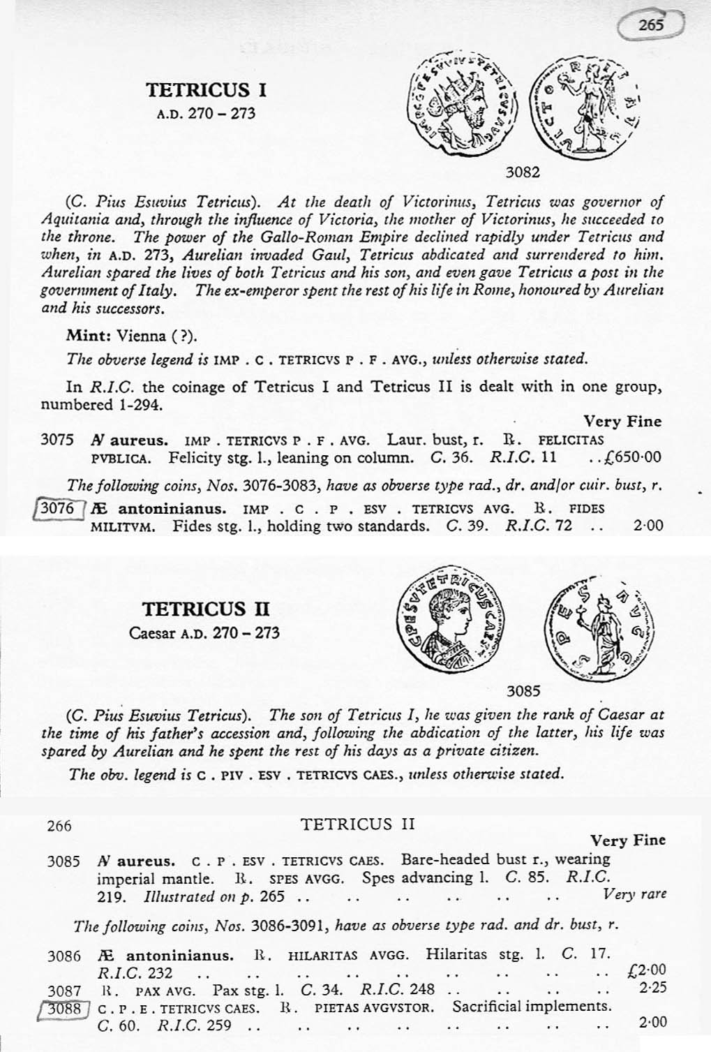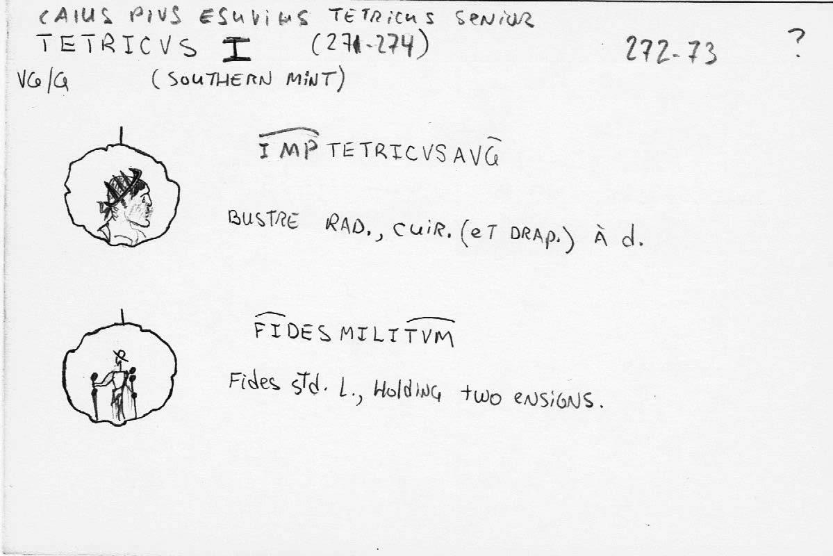 Sources: Wikipedia (Tetricus I [FR/EN], Fides), Google, FAC (Tetricus I, Fides, Military Ensigns, Signa militaria, Legionum Insignia, Roman standard, vexillum), ERIC (Tetricus I); RIC v. 5, pt. 2: 71, Sear RCV (1983): 3076; Numismatics, WildWinds (text, image), GallicEmpire, FAC [Cologne Mint, issue 3, FIDES MILITVM type], CoinProject, CoinSpot. Voir aussi ma fiche.