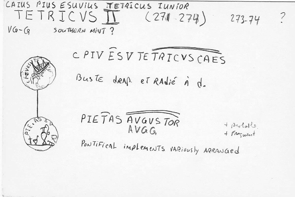 Sources: Wikipedia (Tetricus II [FR/EN]), Google, FAC (Tetricus II, Pietas, PIETAS AVGG, aspergillum, simpulum, capis, Secespita, lituus), ERIC (Tetricus II); RIC v. 5, pt 2: 254 ou 258, Sear RCV (1983): 3088; CoinProject, ARC, numismatics, FAC (Cologne Mint, issue 6, PIETAS AVGVSTOR type), WildWinds (text, image), GallicEmpire, BeastCoins, vcoins, CoinArchives (1, 2, 3), HarvardMuseum, FralinMuseum. Voir aussi ma fiche.