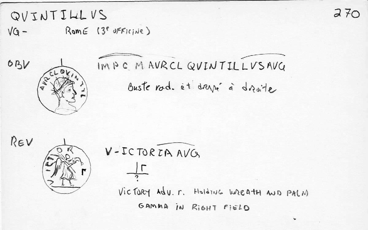 Sources: Wikipedia (Quintillus [FR/EN]), Google, FAC (Quintillus, Victoria Aug, Victory, wreath, laurel wreath, palm), ERIC (Quintillus);  RIC V-I: 33; CoinArchives, WildWinds (text, image), vcoins, acsearch, catwiki, CoinTalk, Numismatics, nomosag. Voir aussi ma fiche.