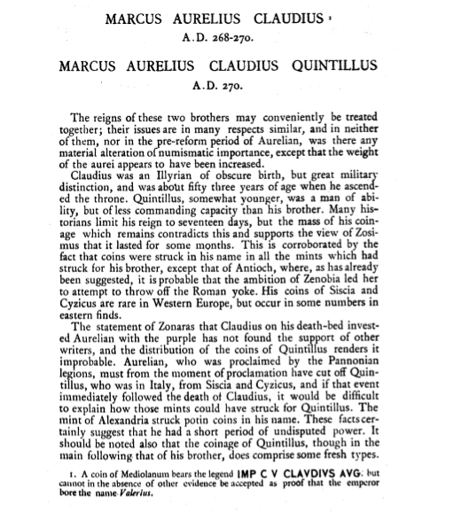 Aussi, “De nombreux historiens limitent le règne de [Quintillus] à dix-sept jours, mais la masse de son monnayage qui nous est parvenu contredit cela et soutient l’opinion de Zosimus selon laquelle il a duré quelques mois. Ceci est corroboré par le fait que des pièces ont été frappées à son nom dans tous les ateliers  qui avaient frappé pour son frère, sauf celui d’Antioche, où (…) il est probable que l’ambition de Zénobia l’a amenée à tenter de se débarrasser du joug de l’Empire romain. Ses pièces de Siscia et de Cyzicus sont rares en Europe occidentale, mais apparaissent en nombre dans les trouvailles orientales. Cela s’explique par le fait que “Aurelianus, qui a été proclamé par les légions de Pannonie, a dû dès le moment de la proclamation couper Quintillus, qui était en Italie, de Siscia et de Cyzicus (…)“. Une telle “distribution des monnaies de Quintillus“ rend improbable la “déclaration de Zonaras selon laquelle Claudius sur son lit de mort a investi Aurelianus de la pourpre (…). Ces faits suggèrent certainement que [Quintillus] a eu une courte période de pouvoir incontesté” [RIC, p.201].