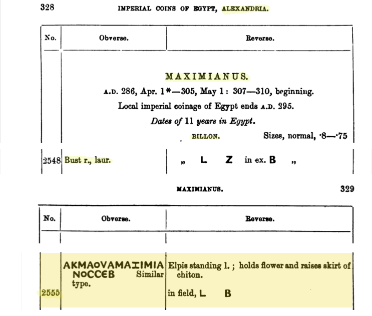 Sources: Wikipedia (Maximianus [FR/EN]), Google, FAC (Maximianus, Elpis), ERIC (Maximianus); BMCG v. 15: 2555 [Poole, R.S. British Museum Catalogue of the Greek Coins, v. 15: Of Alexandria and the nomes. (London, 1892), pp. 329]. acsearch, vcoins, WildWinds (text, image). Voir aussi ma fiche.
