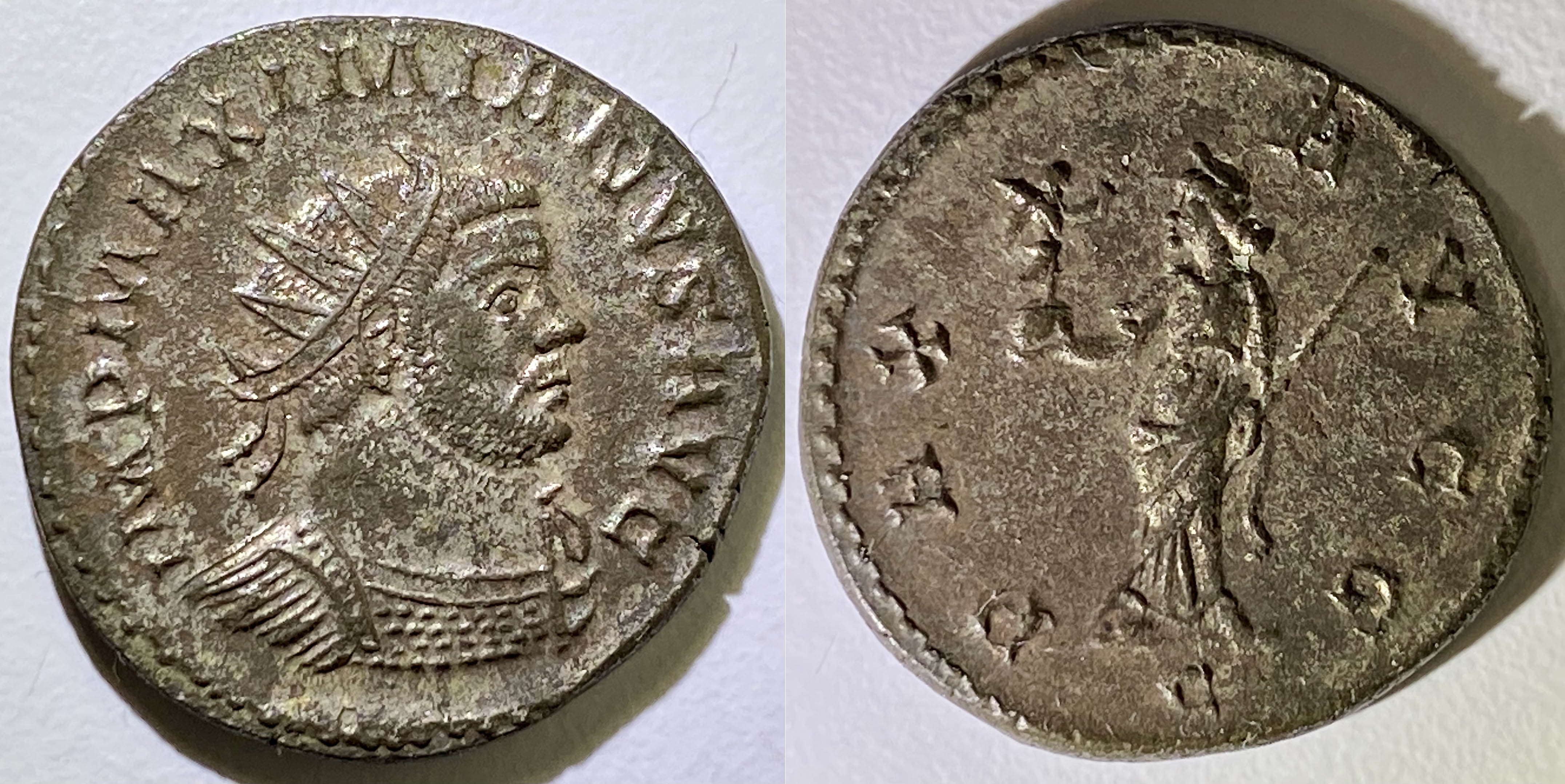 La première est un très très beau antoninianus / aurelianus (VF [Very Fine], AE / BI [Bronze argenturé / Billon], 22 mm, 4.089 g, payé environ $6 le 1985/06/16, patine brunâtre avec traces d’argenture; die-axis: ↑↓). L’avers nous offre un buste de l’empereur radié, cuirassé (et drapé sur l’épaule) à droite, avec l’inscription latine IMP[ERATOR] MAXIMIANVS AVG[VSTVS]. Le revers illustre une Pax (Paix) debout à gauche, tenant une petite victoire sur un globe et un long sceptre, avec l’inscription latine PAX A-VGG[VSTORVM] (“la Paix des deux empereurs”) et un “C” en exergue (marque de la troisième officine).