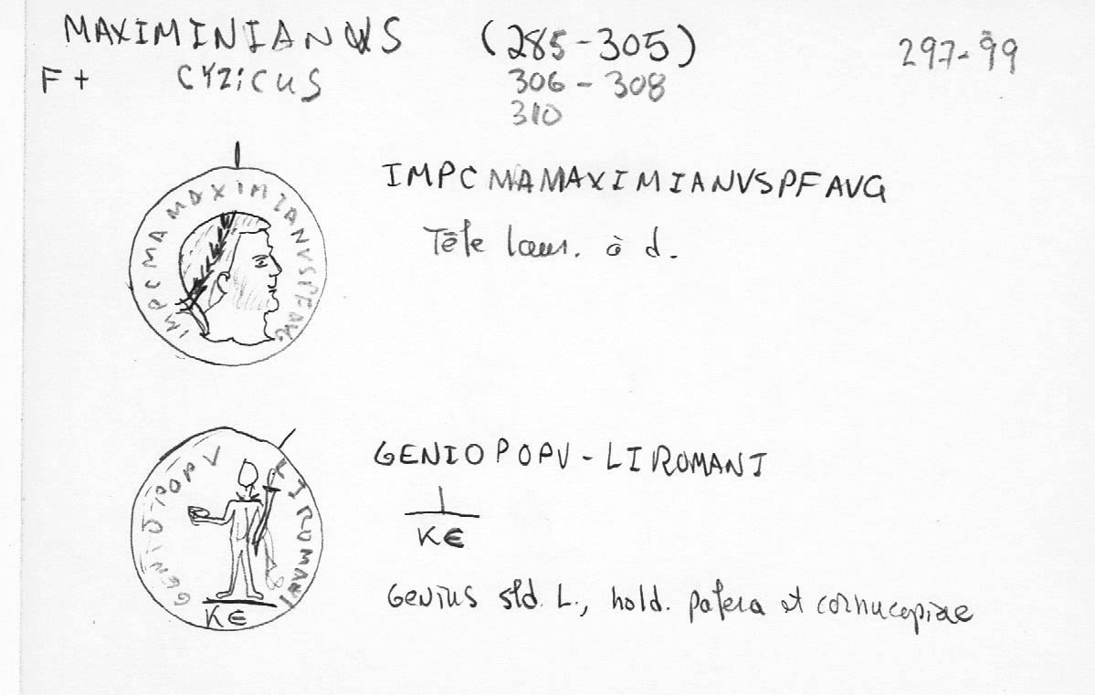 Sources: Wikipedia (Maximianus [FR/EN]), Google, FAC (Maximianus, Genio Populi Romani, genius, modius, patera, cornucopiae), ERIC (Maximianus); RIC v. 6: 12b; acsearch (01, 02, 03), CoinArchives, NumisBids, RCS. Voir aussi ma fiche.