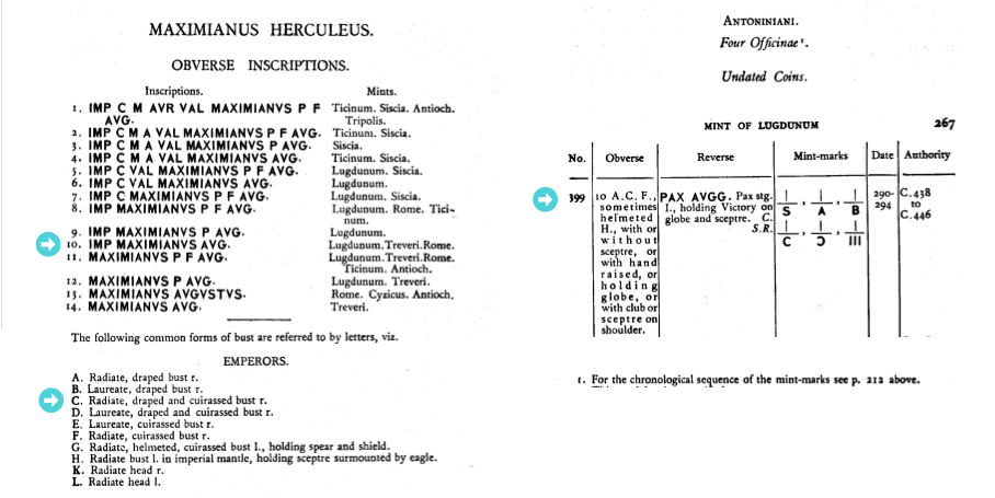 Sources: Wikipedia (Maximianus [FR/EN]), Google, FAC (Maximianus, Pax), ERIC (Maximianus); RIC v. 5, pt. 2: 399; Sear RCV (1983): 3517; acsearch, ARC, BeastCoins, CoinArchives, CoinProject (B: 01, 02), Numismatics, WildWinds (B: text, image; S: text, image). Voir aussi ma fiche.