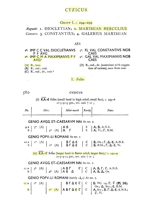 Selon le RIC (Sutherland, C.H.V.; Ed. By Sutherland C.H.V. & Carson, R.A.G. The Roman Imperial Coinage, vol. VI: From Diocletian Reform (294) to the death of Maximinus (313). London: Spink & Son, 1967, p. 580), cette pièce a été frappée à l’atelier de Cyzique en 297-99 EC car elle appartient au groupe I, Aes I (iii) — cette titulature n’apparait que dans ce groupe, le follis est d’un format plus large et l’avers présente une tête plus large. Il s’agit de la première pièce post-réforme que je vous présente.