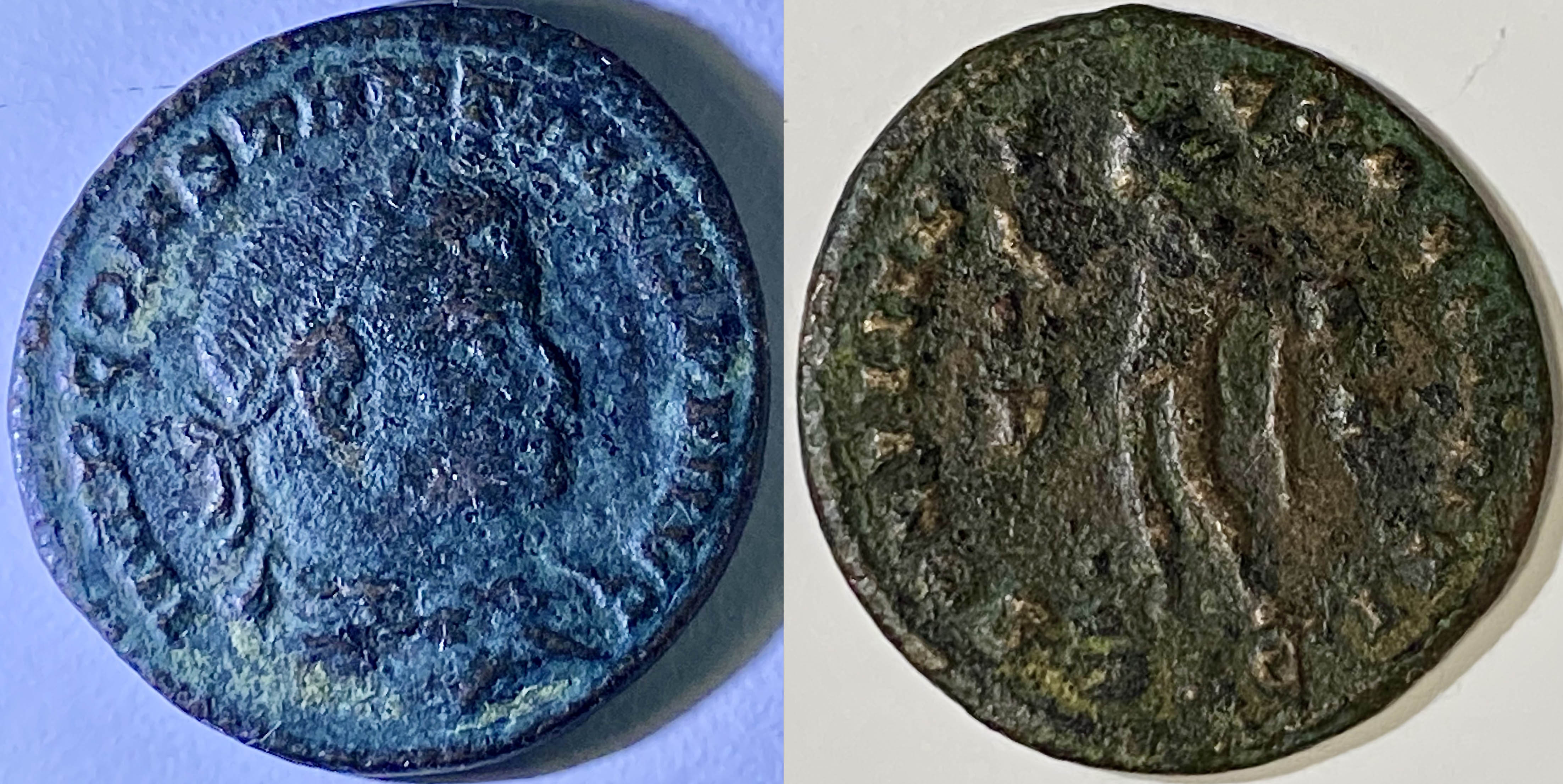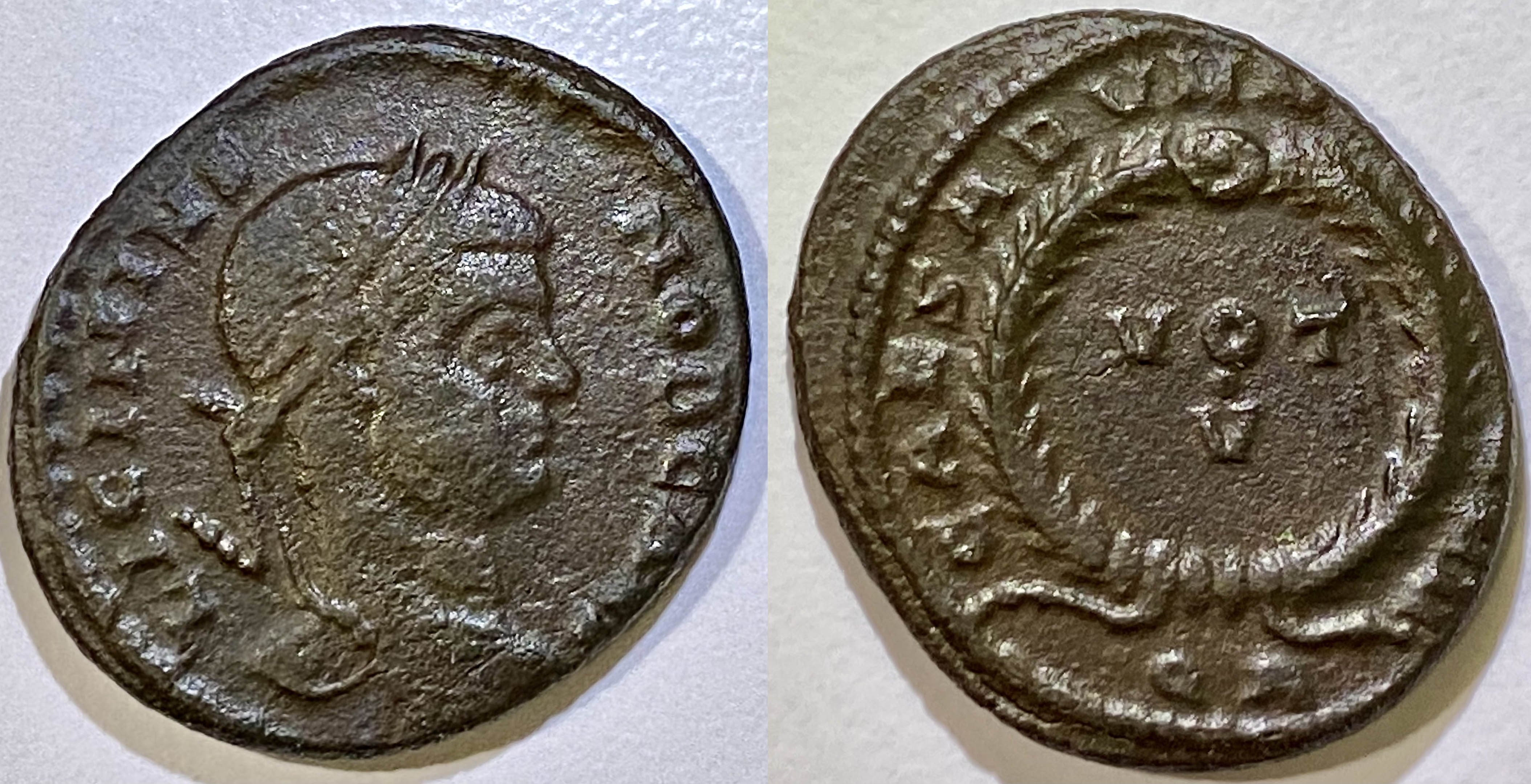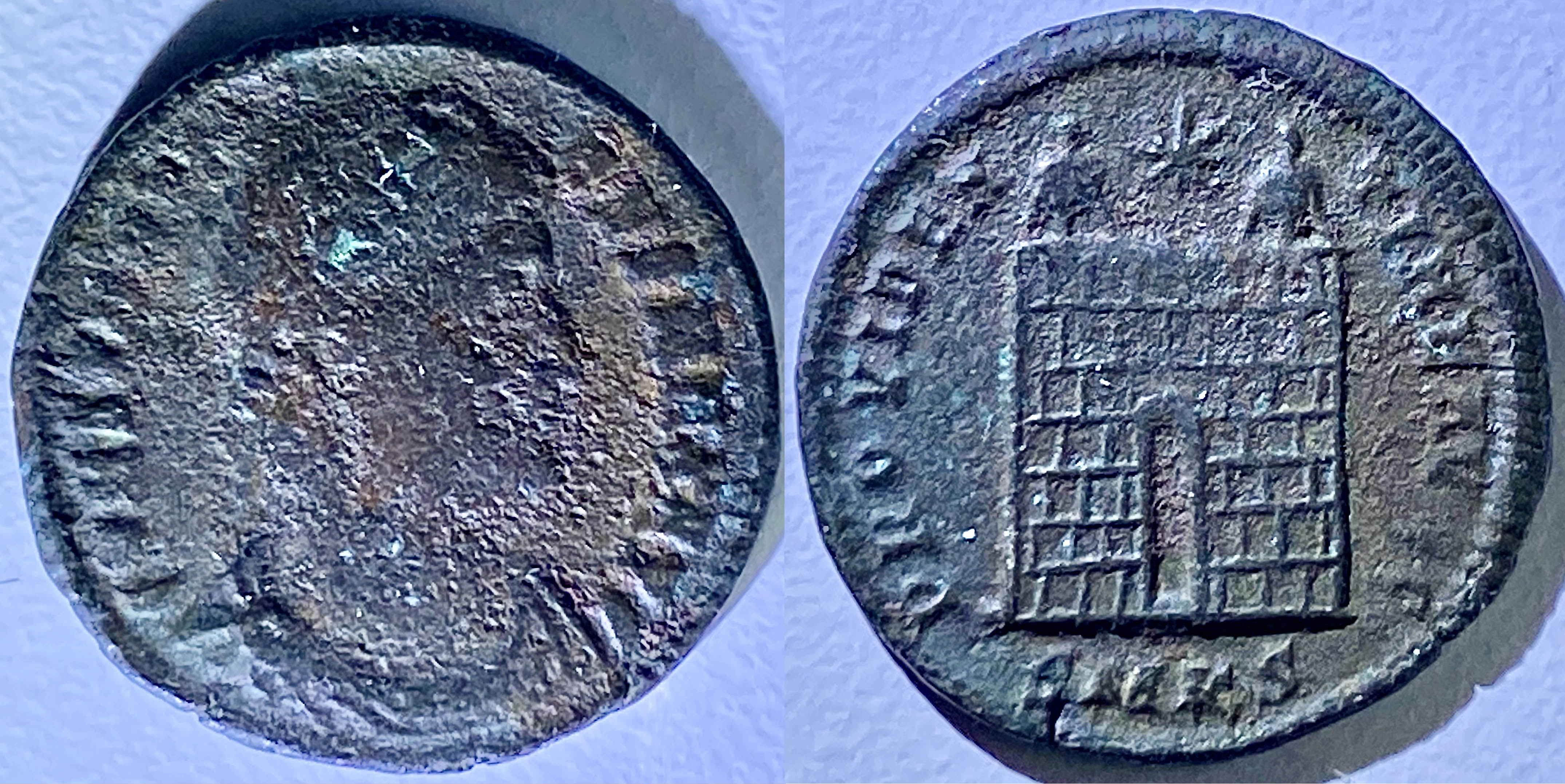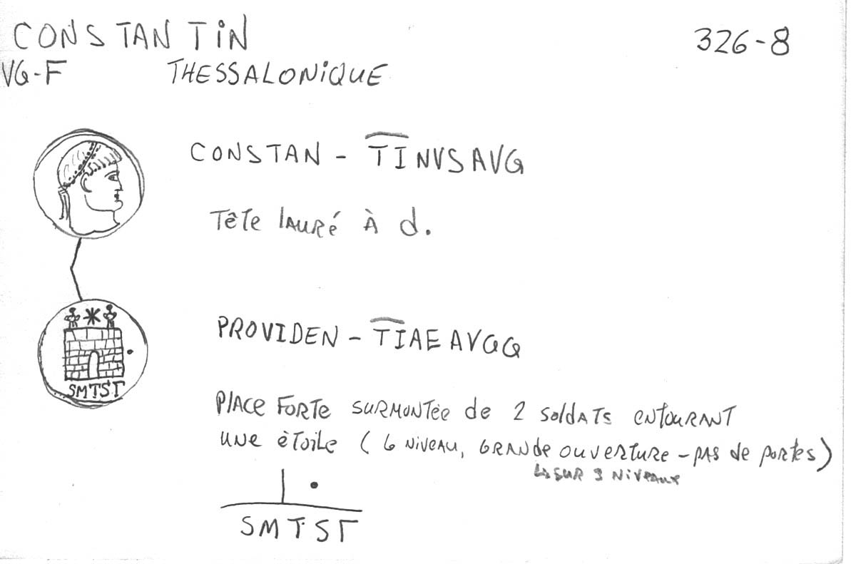 La première pièce est un beau follis réduit (AE3, VG [Very Good], AE [Bronze], 18 x 19 mm, 2.890 g, payé environ $6 le 1985/04/14; die-axis: ↑↓). L’avers nous montre une tête de l’empereur laurée à droite, avec l’inscription latine CONSTAN-TINVS AVG[VSTVS]. Le revers illustre une place forte (constituée de six niveaux et d’une grande ouverture [sur trois niveaux et demi] qui n’a pas de porte) surmontée de deux tourelles (ou soldats?) entourants une étoile (❋), avec l’inscription latine PROVIDEN-TIAE AVGG[VSTORVM] (le double “G” équivaut à un duorum implicite; “[Dédié] à la prévoyance des deux empereurs“), et un SMTS𝞒 en exergue (marque de la troisième officine [Gamma] de l’atelier de Thessalonique [Sacra Moneta TheSsalonica]) et un point (•) dans le champs droit.