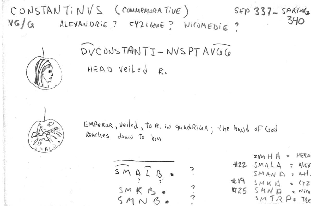 Selon le RIC (Kent, J.P.C.; Ed. by Sutherland C.H.V. & Carson R.A.G., The Roman Imperial Coinage vol. VIII: The Family of Constantine I (337-364). London: Spink & Son, 1981, pp. 472, 491, 540), les seules émissions commémoratives qui correspondent à la description et à la marque d’atelier (quatre ou cinq lettres suivie d’un point [SM??B•]) ont été faite à Alexandrie, Cyzique ou Nicomédie, et toutes entre le 9 septembre 337 et le printemps 340.