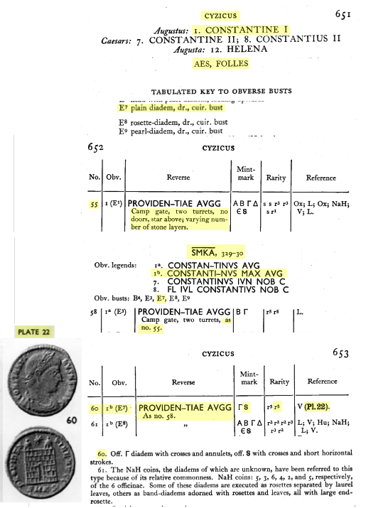 Sources: Wikipedia (Constantinus [FR/EN]), Google, FAC (Constantinus, camp gates), ERIC (Constantinus); RIC v. 7: 153; acsearch, CoinTalk, R5coins, TAC, vcoins, WildWinds (text, image). Voir aussi ma fiche.