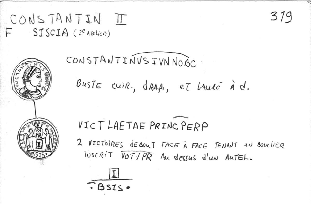 Sources: Wikipedia (Constantinus II [FR/EN]), Google, FAC (Constantinus II, ara, Siscia, VICT. LAETAE PRINC. PERP., Victoria), ERIC (Constantinus II); RIC v. VII: 91; BeastCoins, CoinProject, Numismatics, WildWinds (RIC 91: text1, image1; RIC 99: text2, image2, RIC 99var: text3, image3). Voir aussi ma fiche.