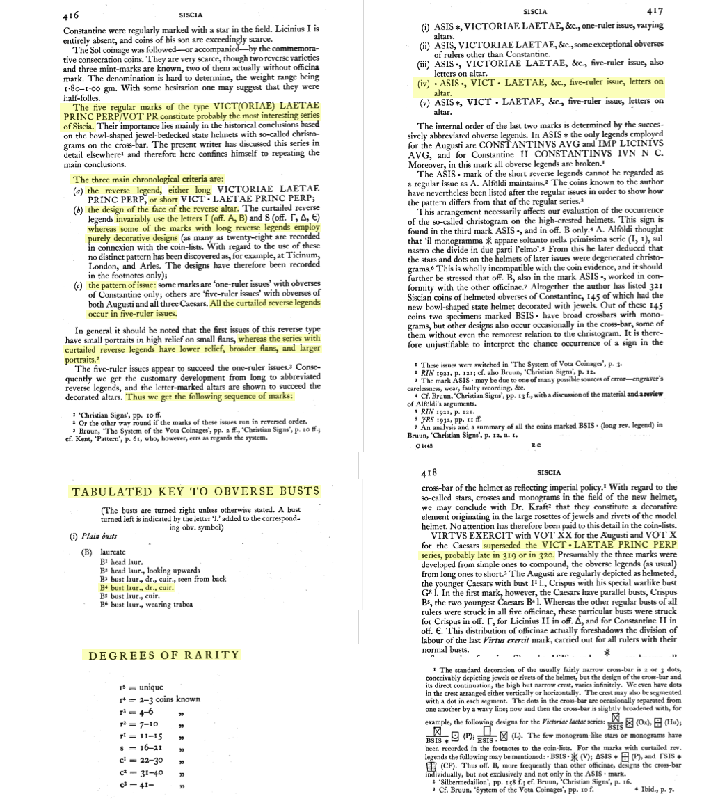 C’est un type de revers que l’on avait pas vu jusqu’à maintenant mais qui ne fait que reprendre des thèmes bien connu: la victoire et les bons souhaits du peuple envers le prince ou l’empereur. Dans ce cas-ci, comme le prince n’est à peine âgé que de trois ans, on imagine que c’est une façon de lui souhaiter une vie longue et prospère. On note également que c’est une pièce rare [r5 = unique! Plus maintenant… 😉 ]; j’ai d’ailleurs eut de la difficulté à en trouver des exemples dans les sources en ligne. Ce type se retrouve surtout chez Constantinus, Crispus et les deux Licinius. Dans le cas de Constantinus Junior, il est aussi associé avec une titulature plus longue (NOB CAES) et une inscription qui présente VICTORIAE écrit tout au long mais dans ce cas-là la marque d’atelier ne comporte qu’un seul point (ASIS•) [RIC, VII, 80]. Une variante inclue aussi une césure dans la nomenclature (CONSTANT-INVS) et la marque d’atelier a une étoile au lieu du point (ASIS*) [RIC, VII, 99]. Finalement, un autre variante (ASIS•, datant de 319-20; RIC, VII, 107-108) ne semble avoir été frappé que par les troisième (𝛤 [gamma] avec un NOB CAES) et la quatrième (𝛥 [delta] avec NOB C) officines. Dans tous les cas ce sont des pièces considérées rares (r3-r5 = une à six pièces connues — par l’auteur du RIC, au moment où il a été publié dans les années soixante).